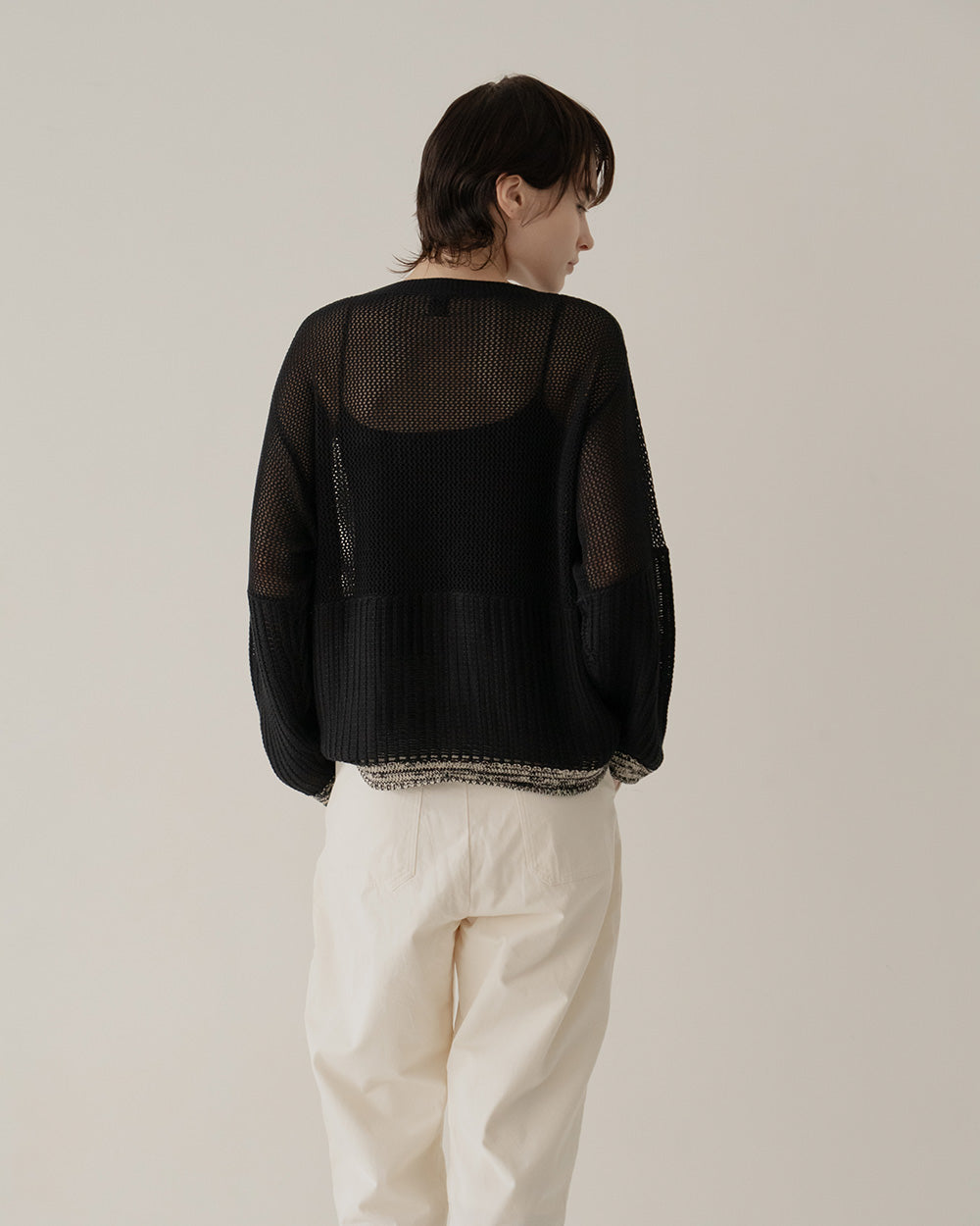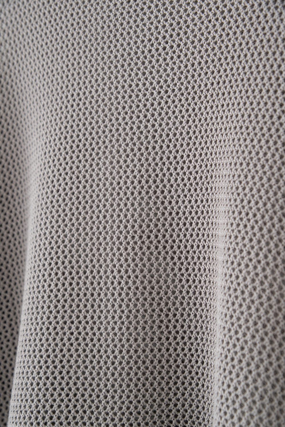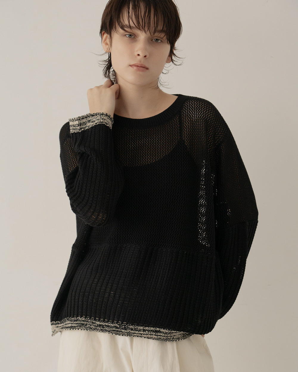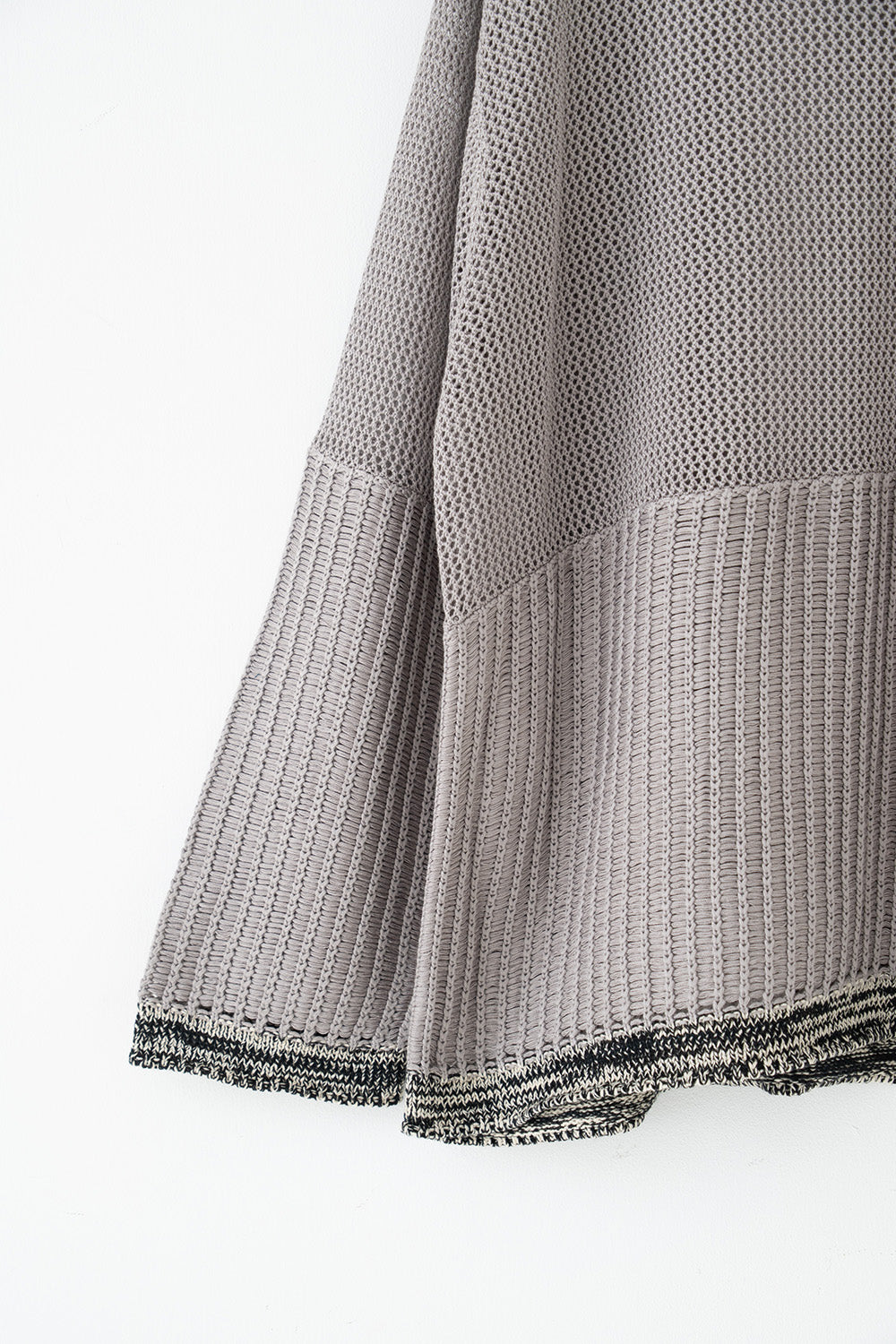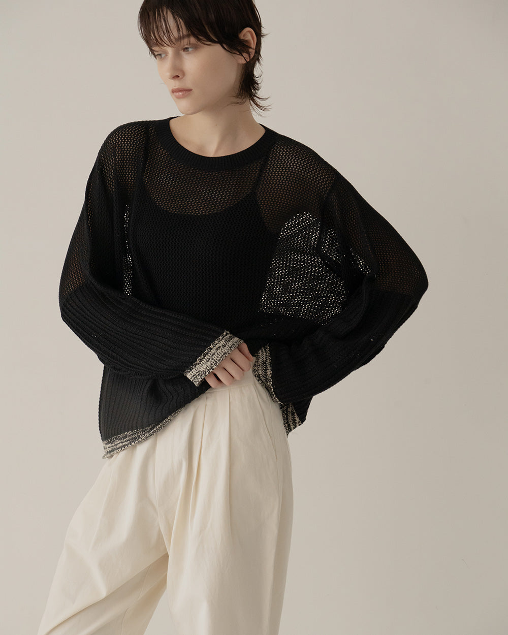 上部は透かし編み(メッシュ)下部を針抜きの天竺編みにしシアー具合が異なるデザインです。