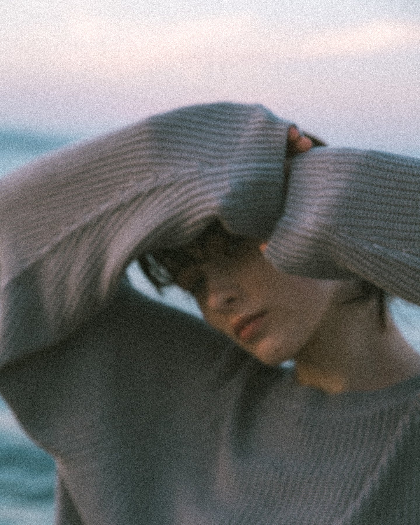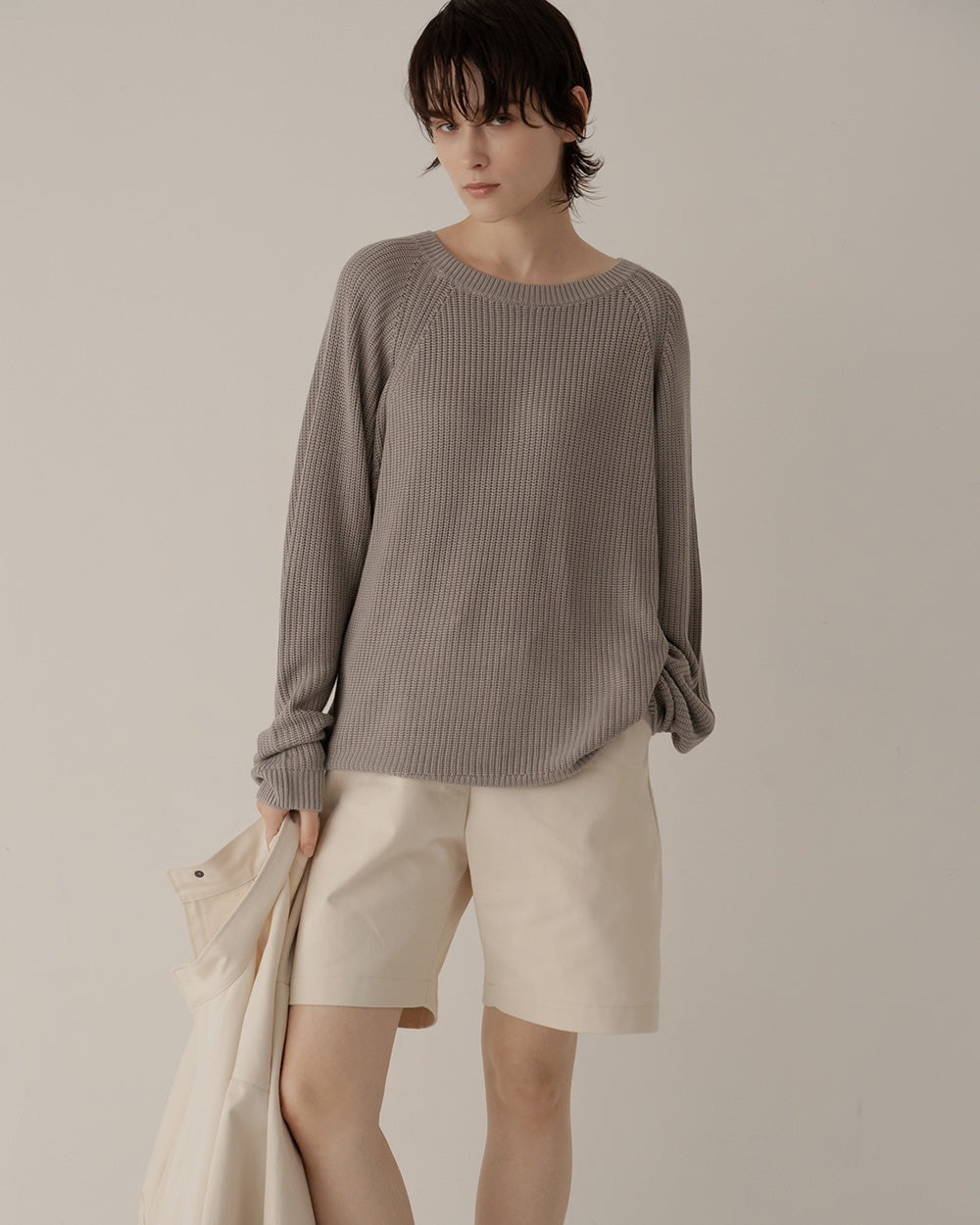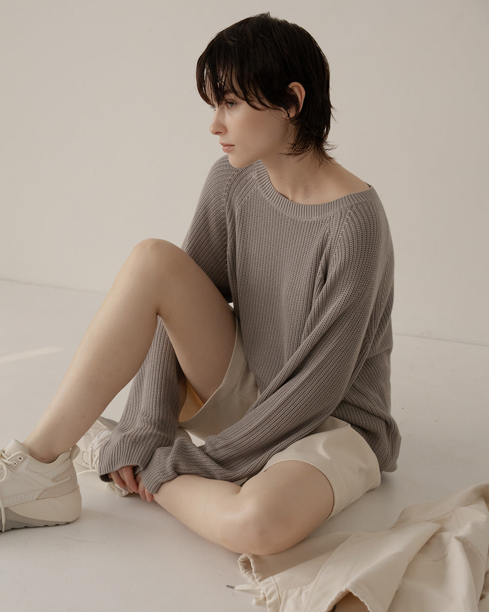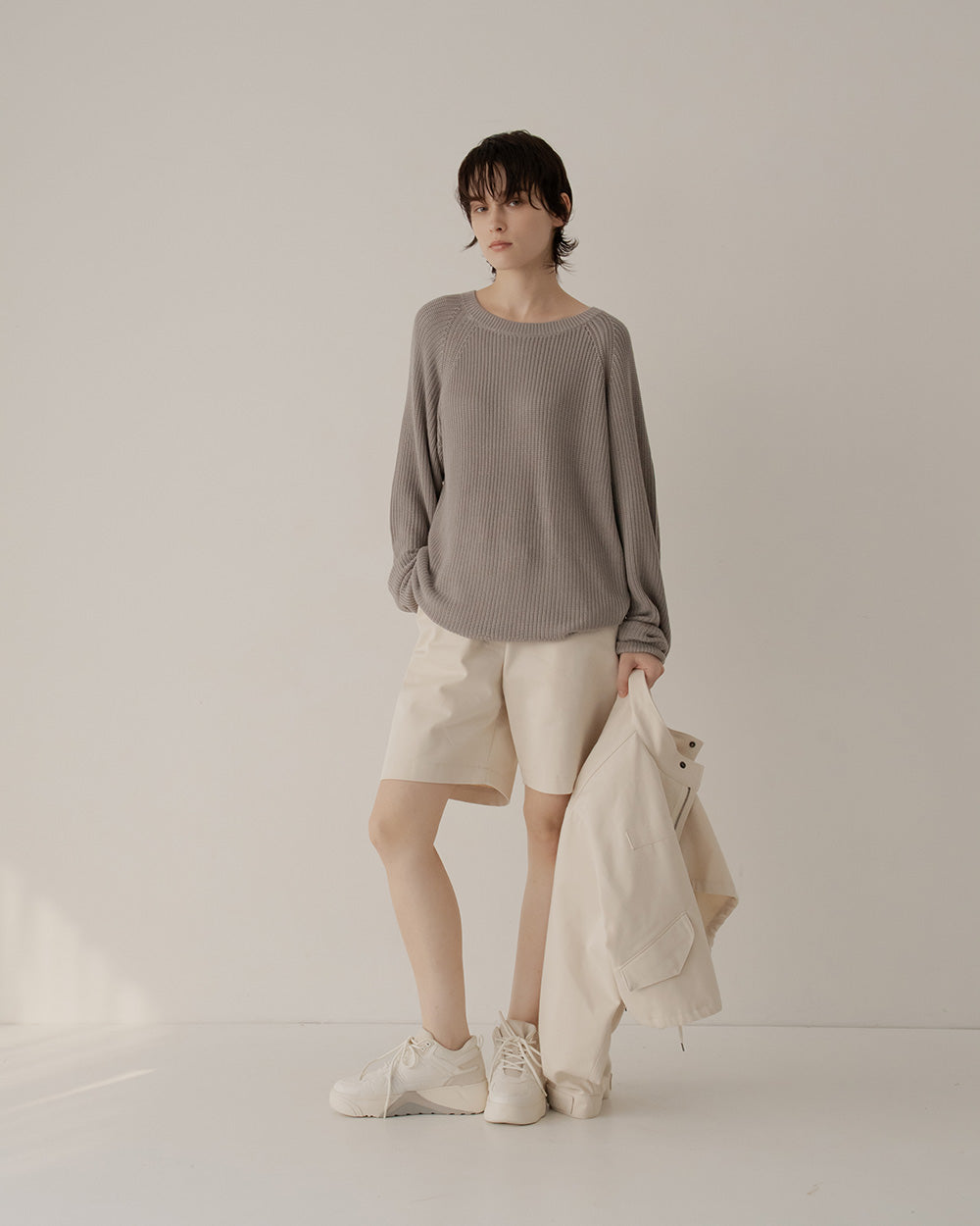 ラグランスリーブとシルキータッチの艶感など25SSコンセプトである"Coastal Breese"の浜辺のそよ風を背景に成熟した人物が佇んでいる様にも合致するアダルトなリラックスニットです。