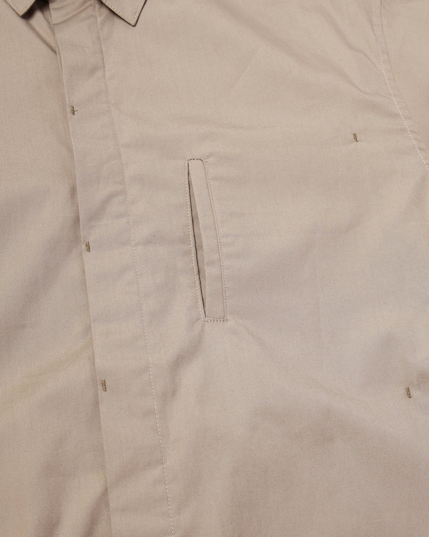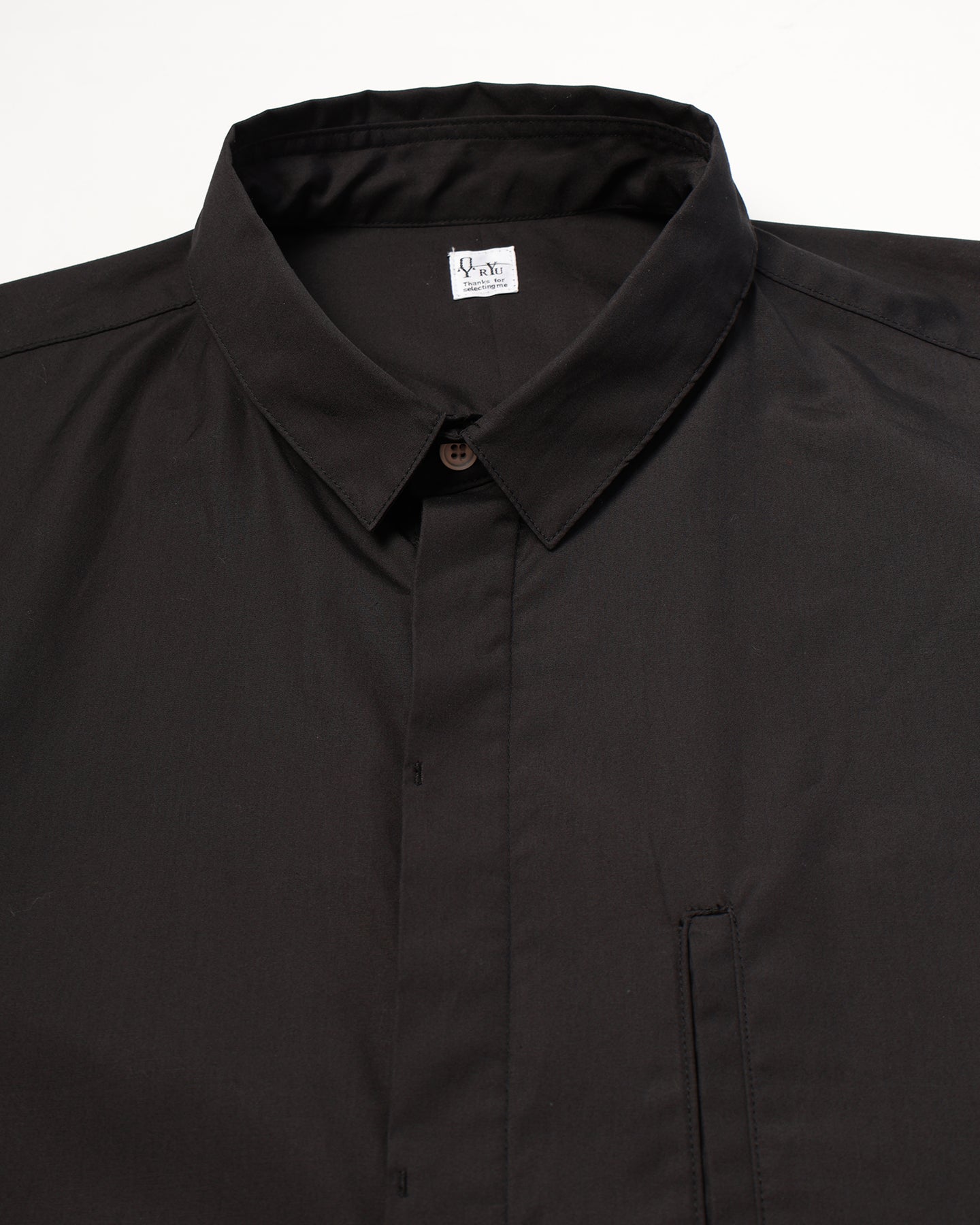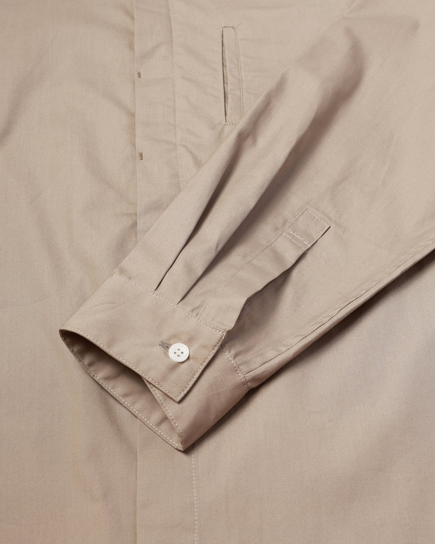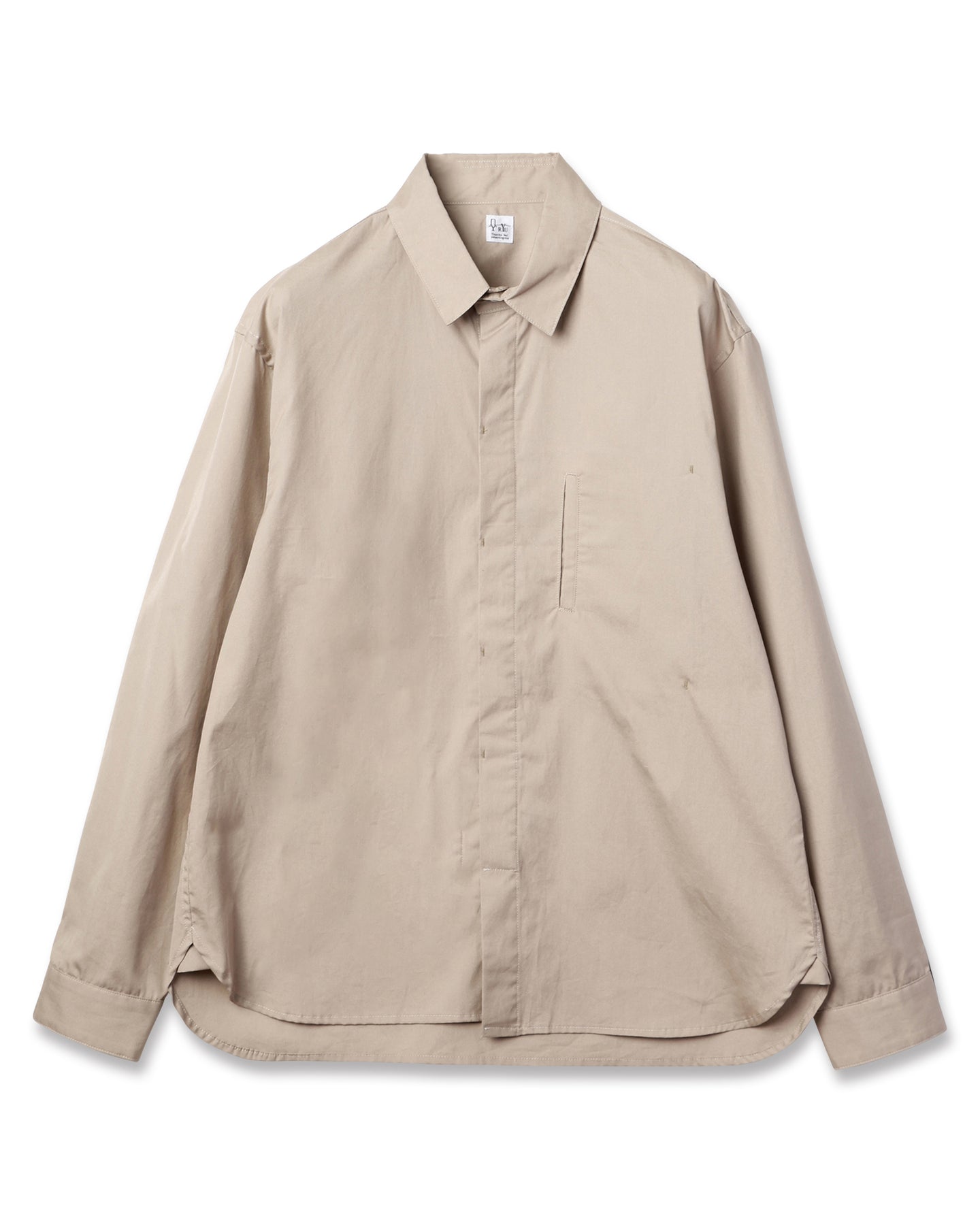 フライフロント、片玉縁の胸ポケットとミニマルな装いを保ってくれており、この生地に落とし込む事で程よい艶感のあるシャツへと仕上げております。