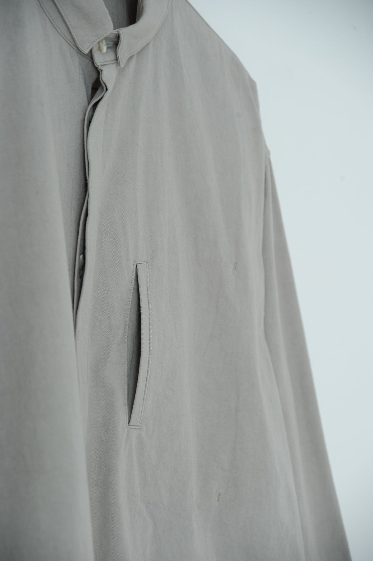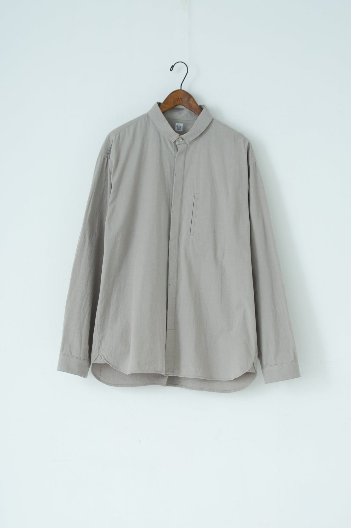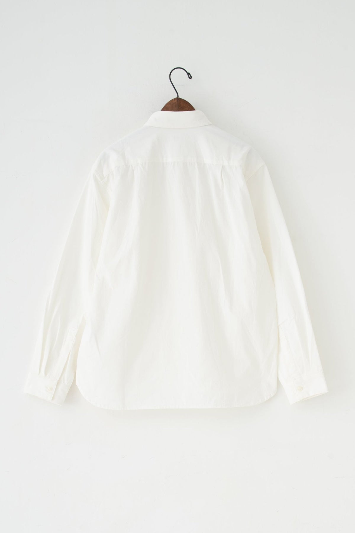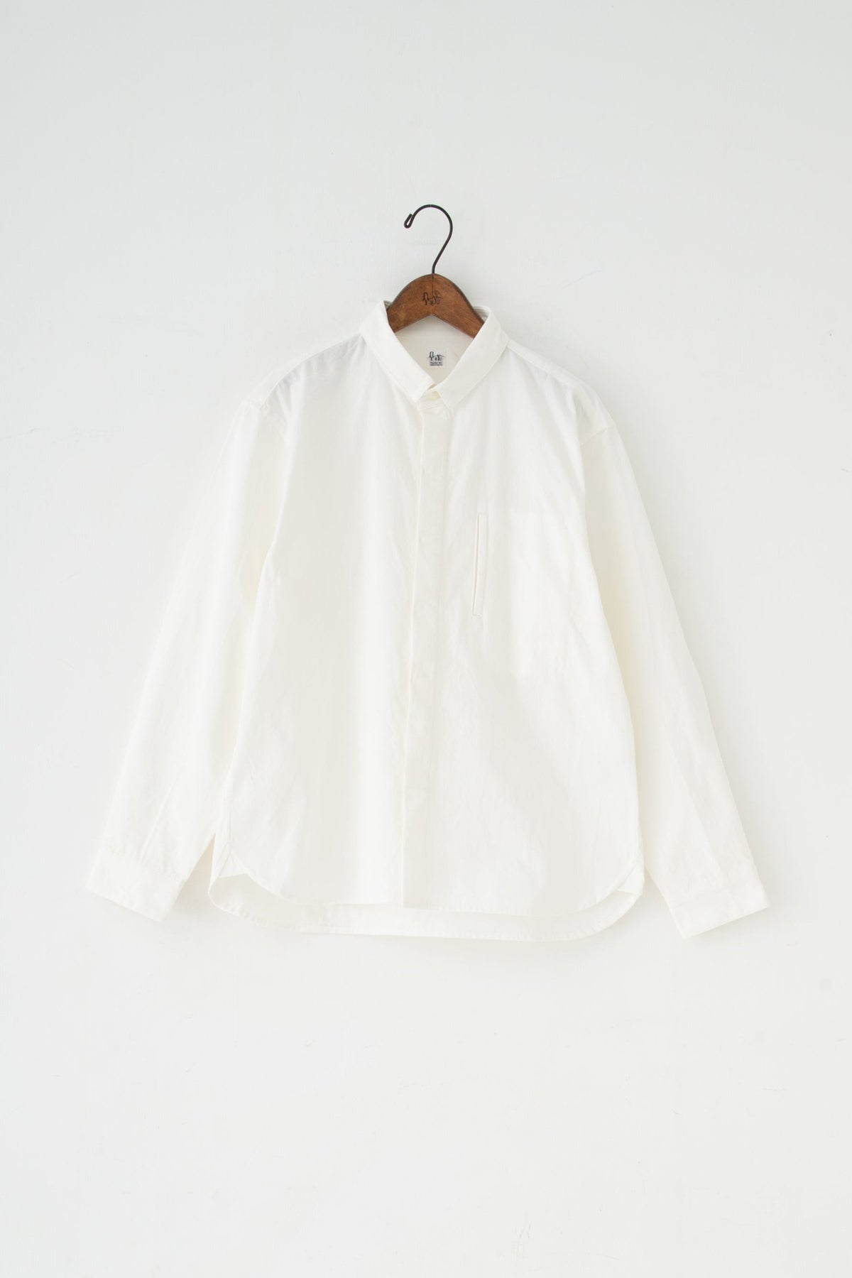 スクエアなちび襟が特徴のシャツは隠しスナップにより、ボタンダウンになっています。襟が浮く事もなく、雰 囲 気通りにミニマルな装いを保ってくれます。