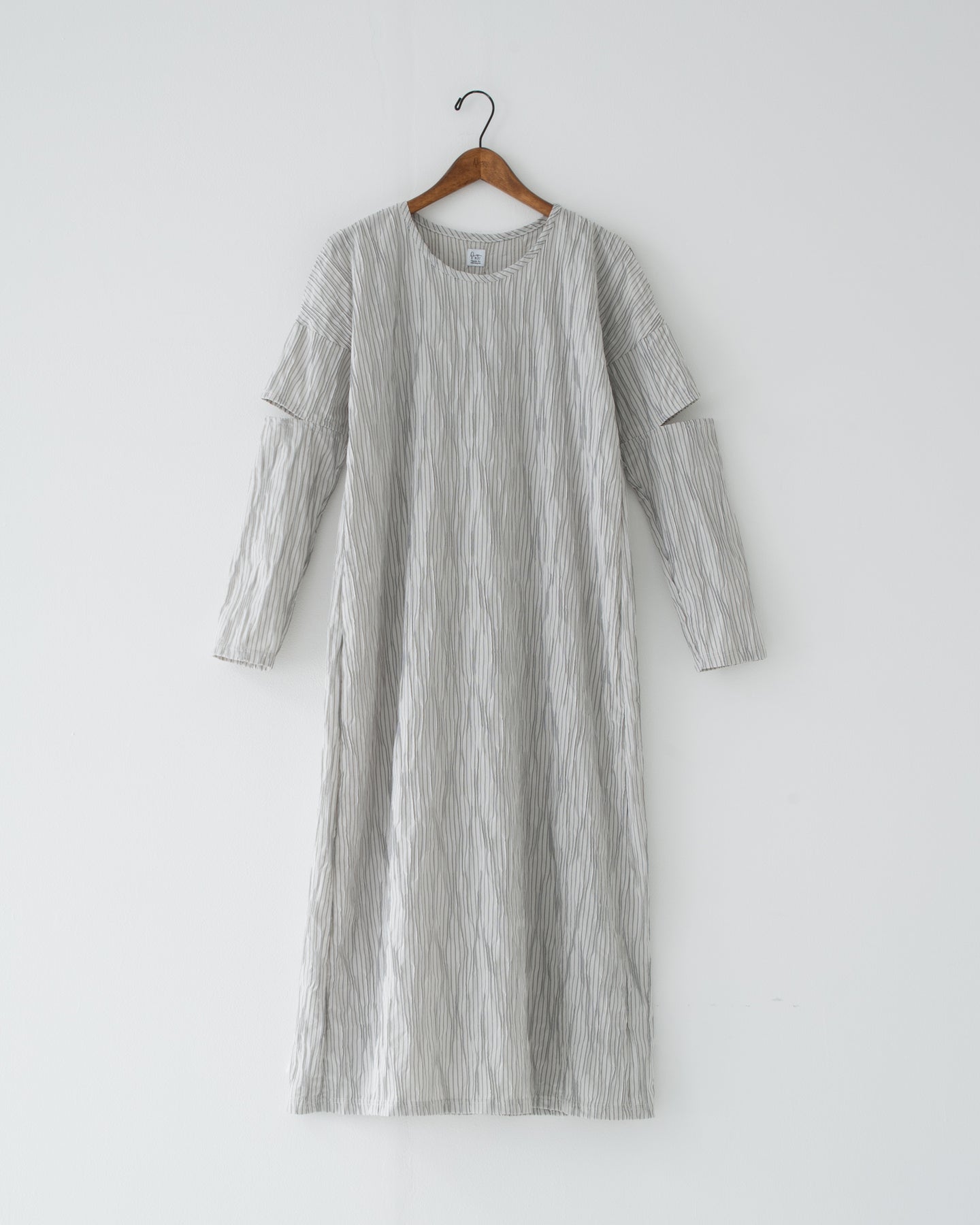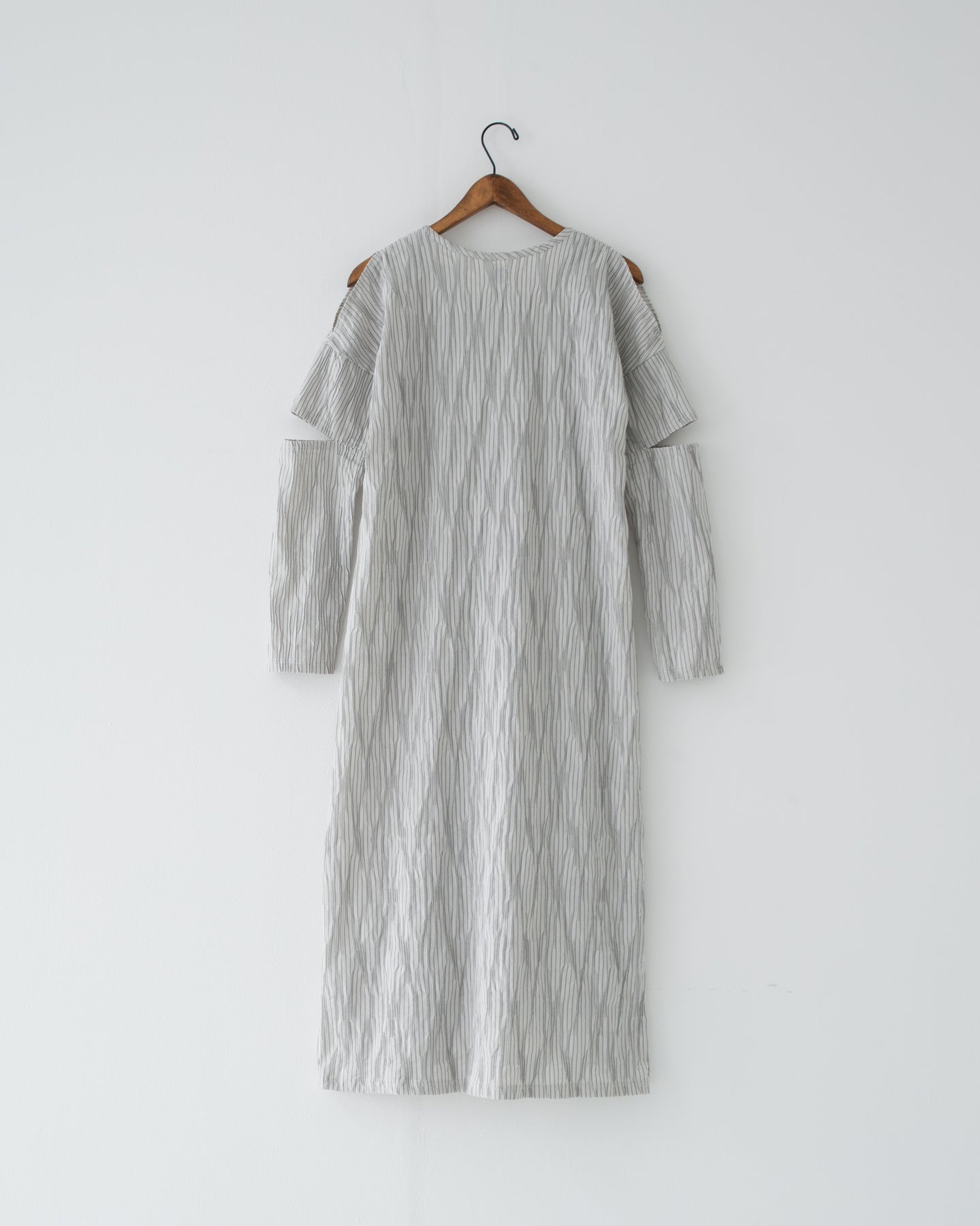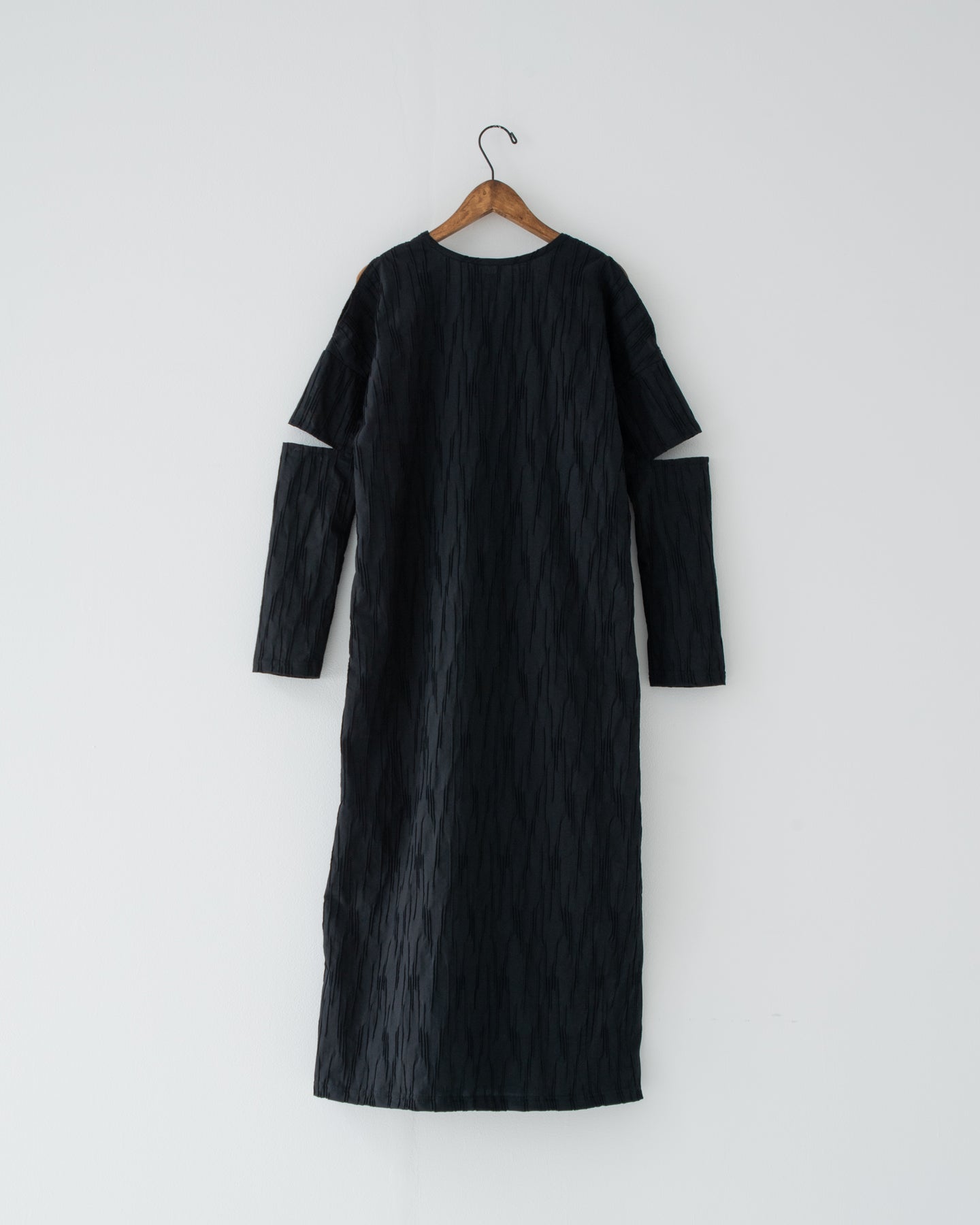 長い着丈と長袖に覆われたシルエットの中にこのスリットが入ることにより軽さを、また、360度で見え方が変わり飽きのこないデザインへと仕上げています。