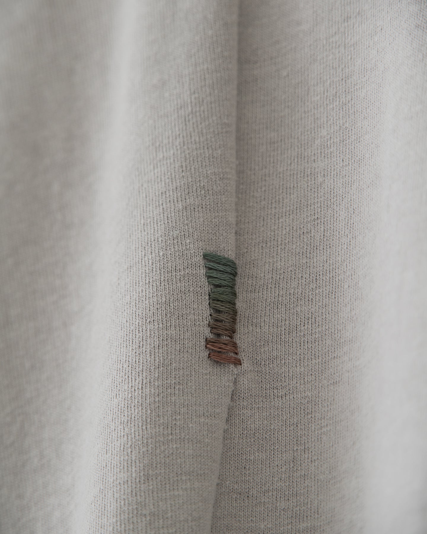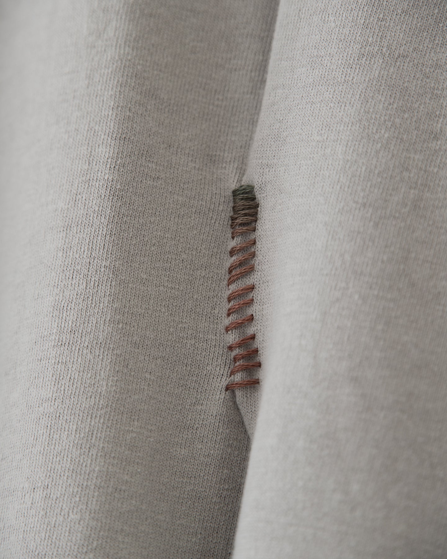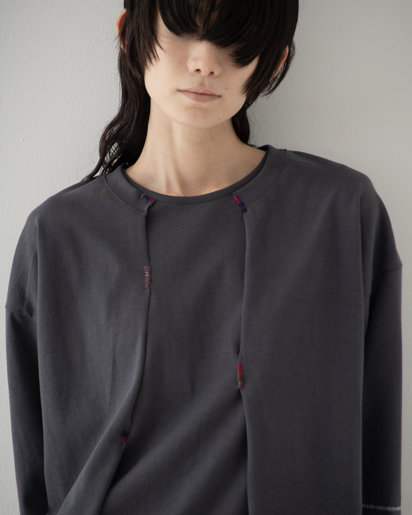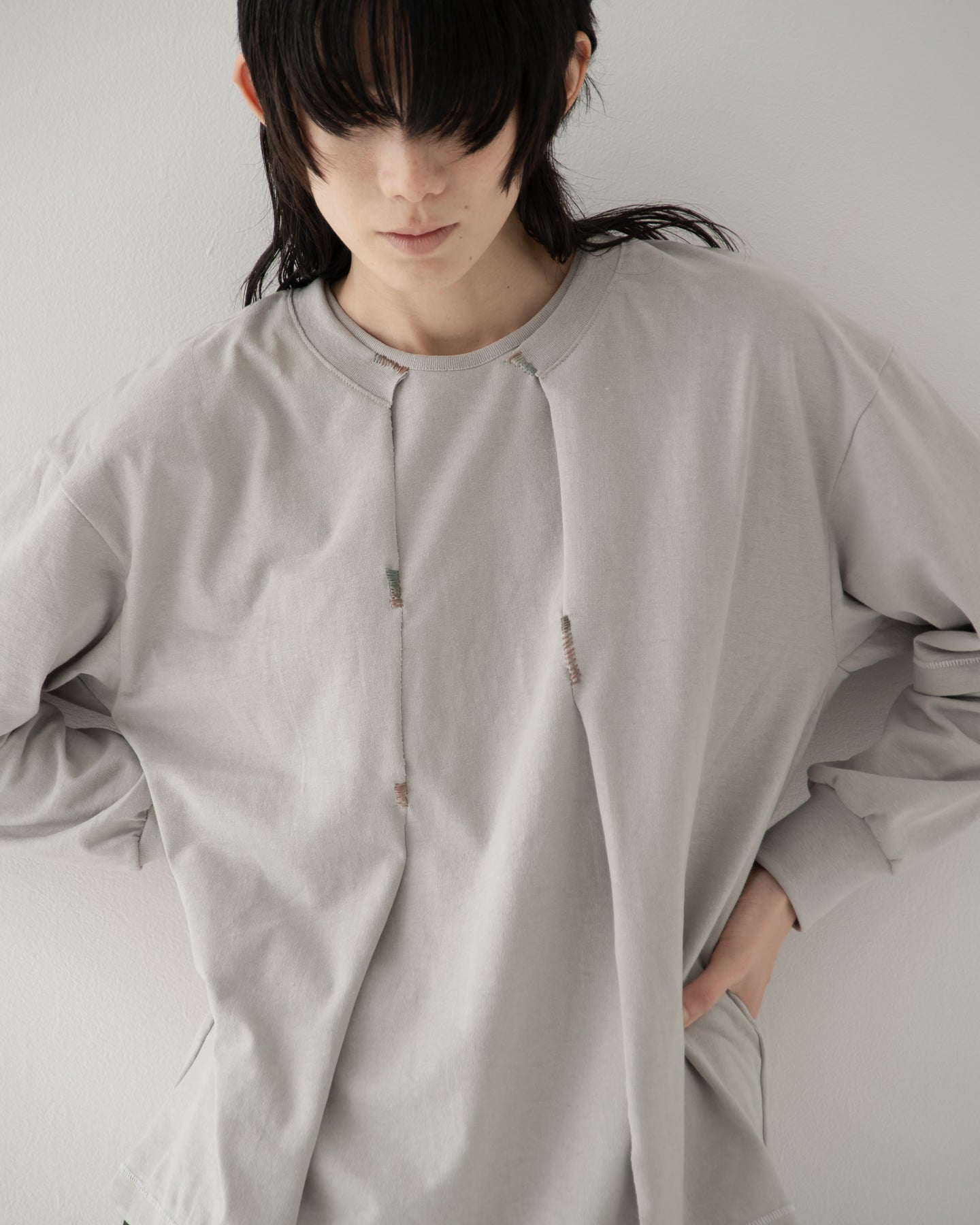 長袖カットソーの上から重ねた半袖は、デザイナー自身の手によって一点一点刺繍糸で縫い止められ、ボディとドッキングされています。