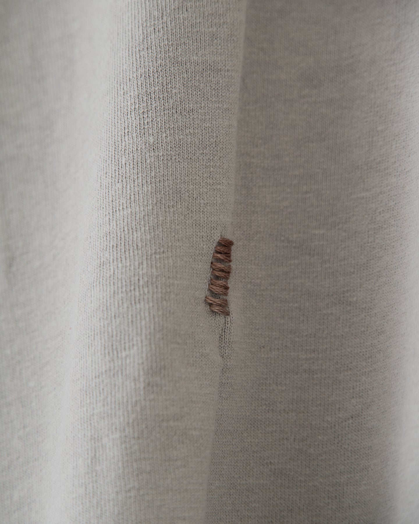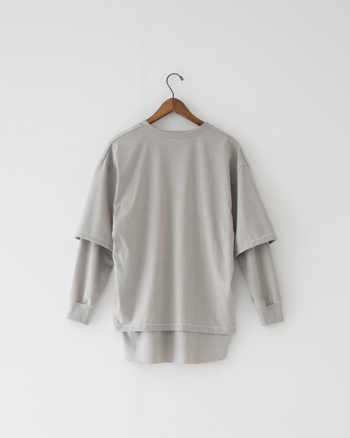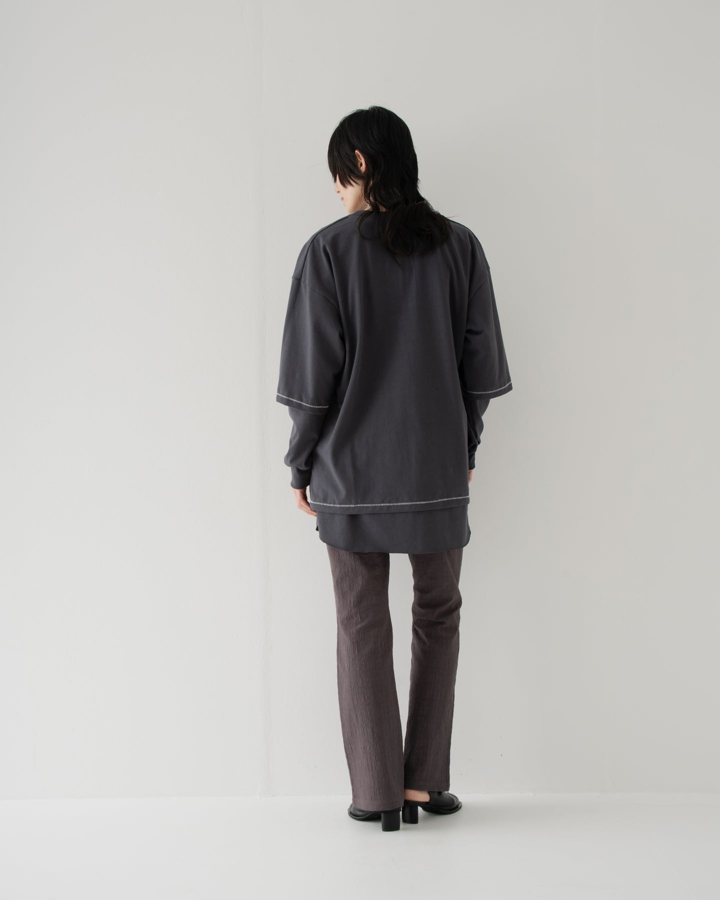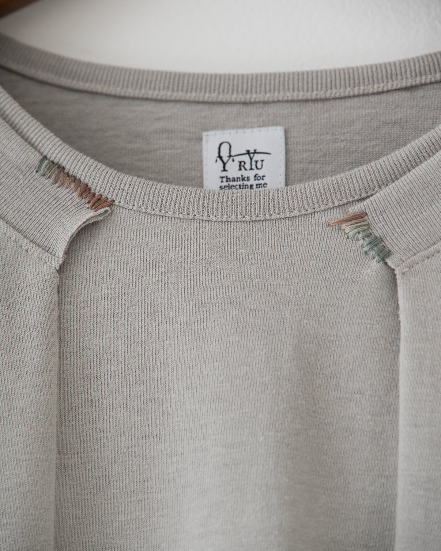 長袖カットソーの上から重ねた半袖は、デザイナー自身の手によって一点一点刺繍糸で縫い止められ、ボディとドッキングされています。