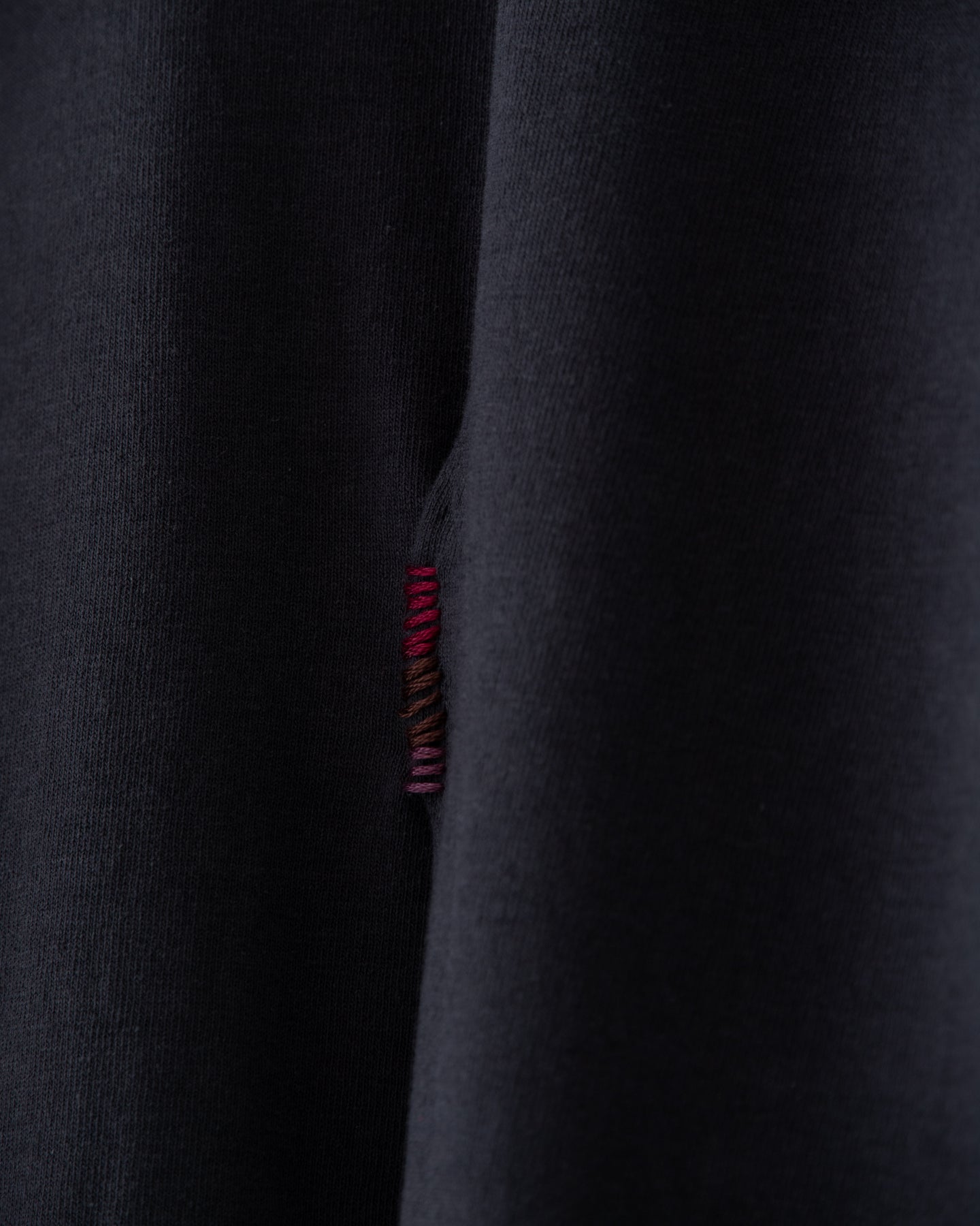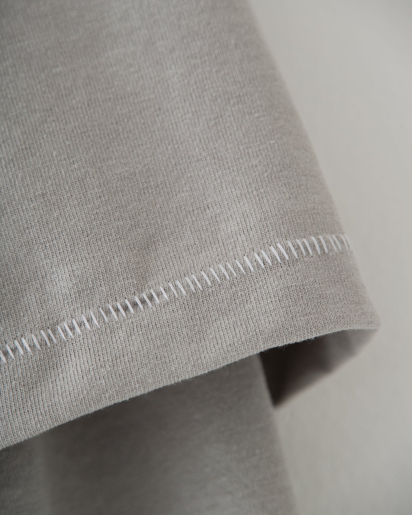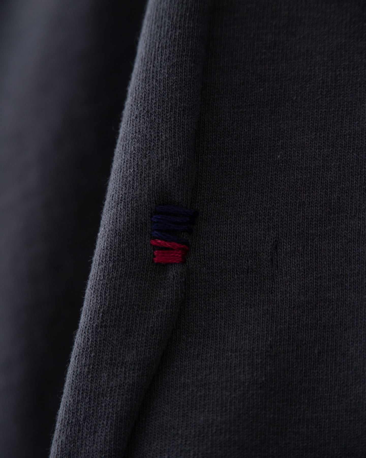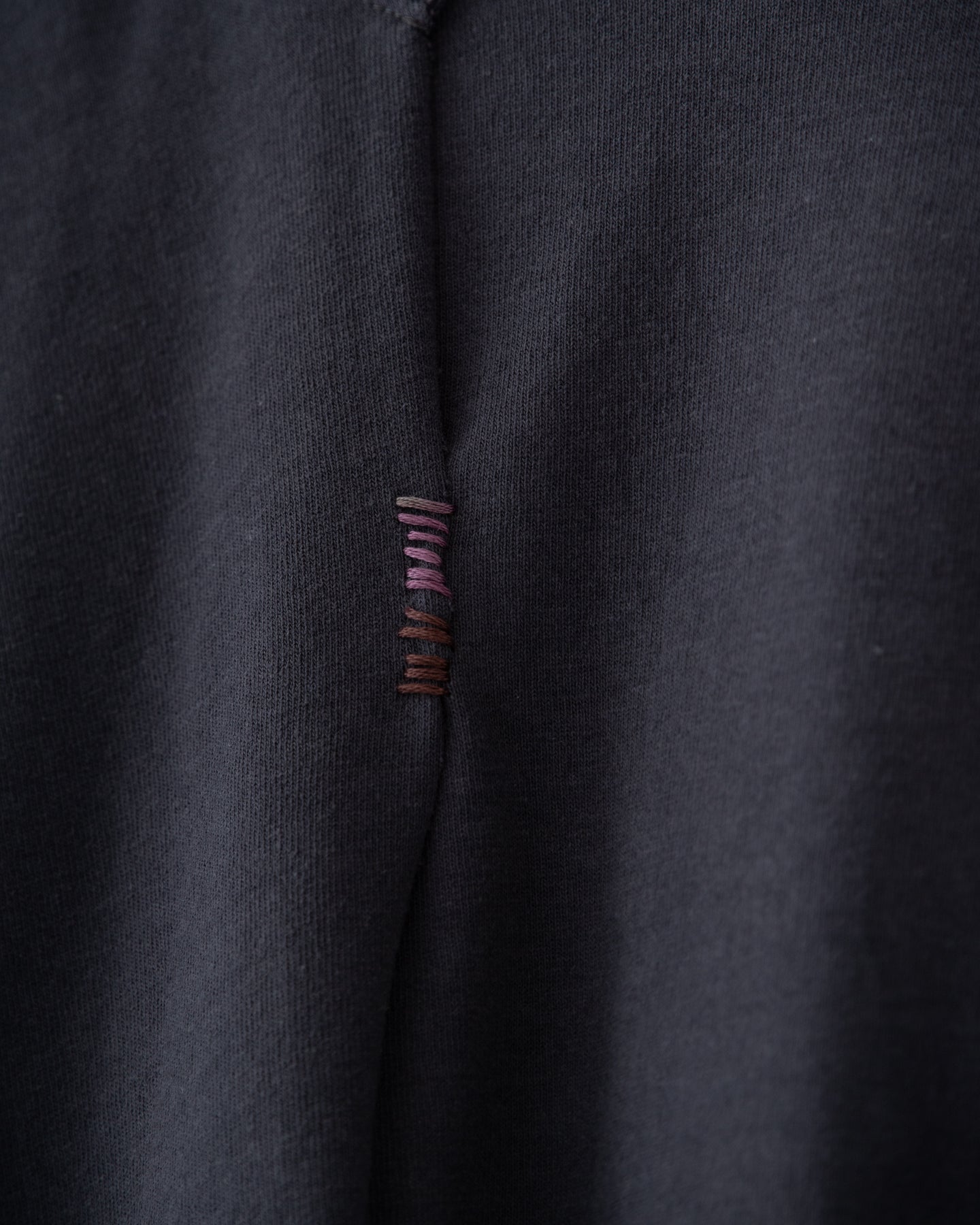 長袖カットソーの上から重ねた半袖は、デザイナー自身の手によって一点一点刺繍糸で縫い止められ、ボディとドッキングされています。