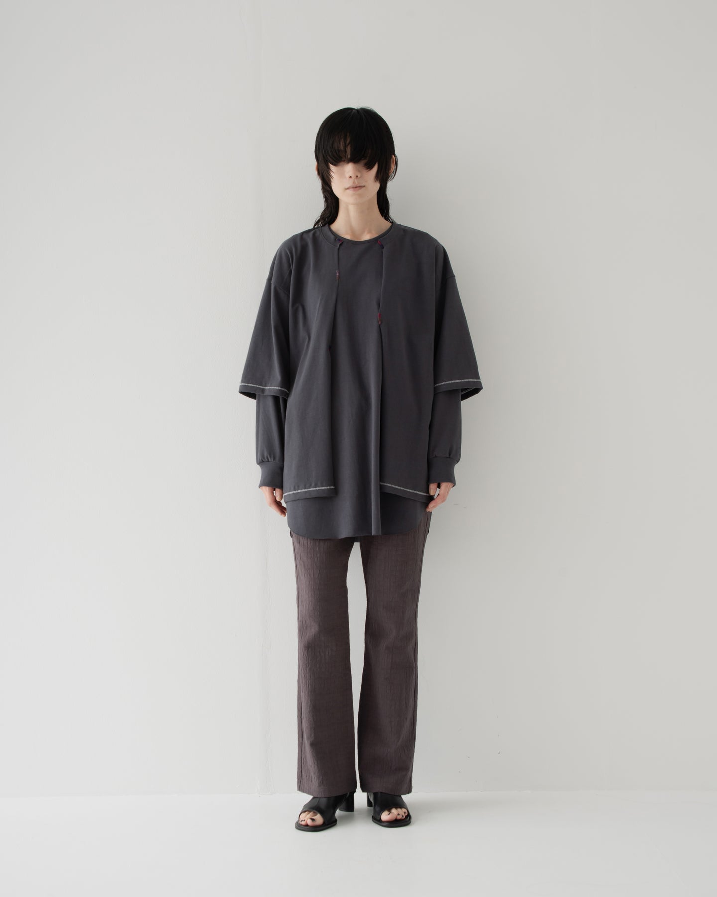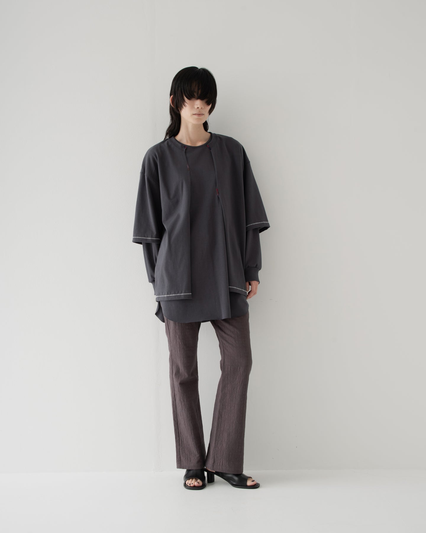 ラフィ天竺のユーズド感をベースに、半袖カットソーをセンターフロントで大胆にカットし、前開きに仕上げたレイヤードトップ。