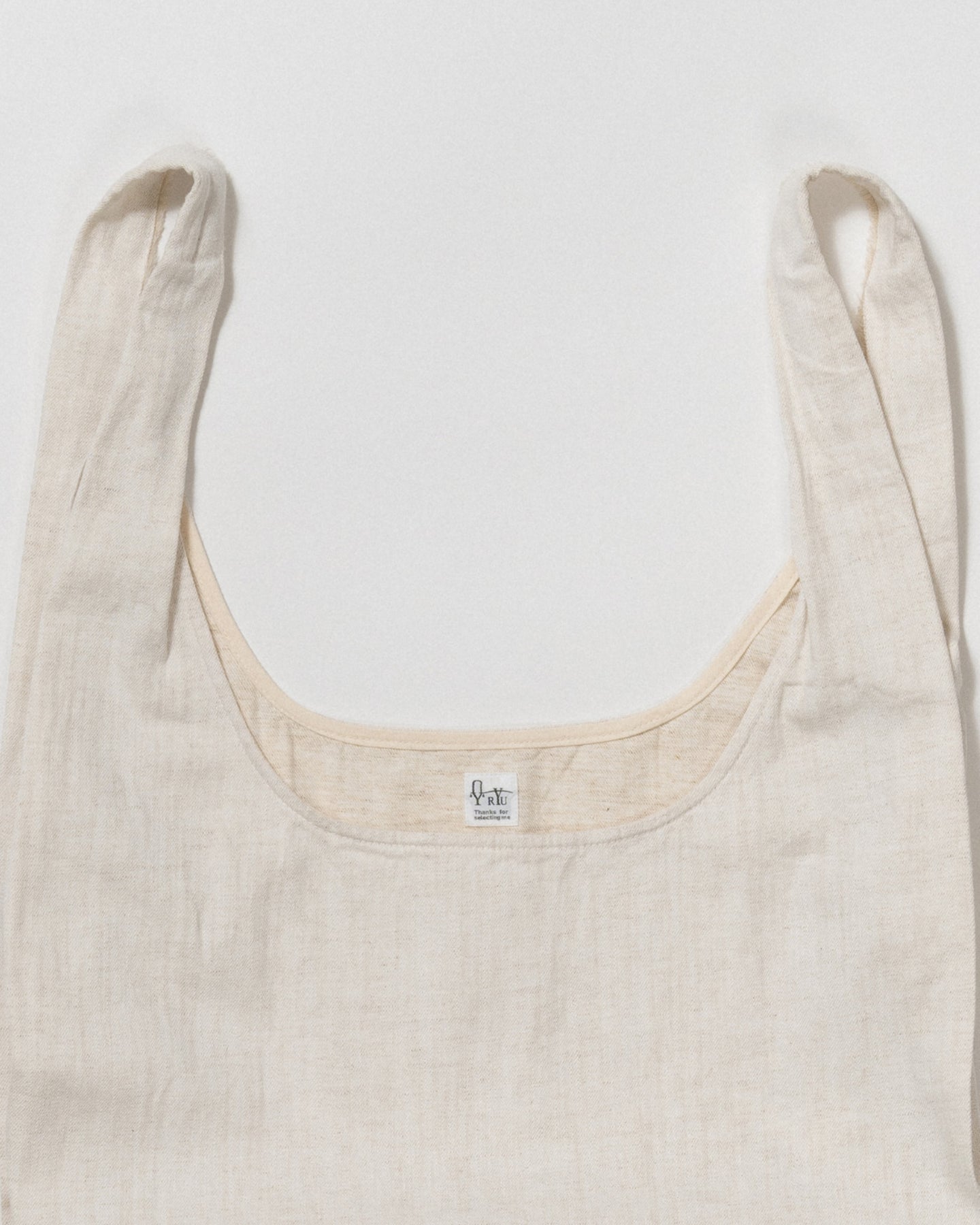 ファッションブランドの"抜け感"を楽しんでいただくのがデザイナーの意図で、度々洋服地でこのアイテムをリリースしています、持ち手周りに生地耳を使用したりなどシンプルでは終わらないのがRYUらしいところです。
