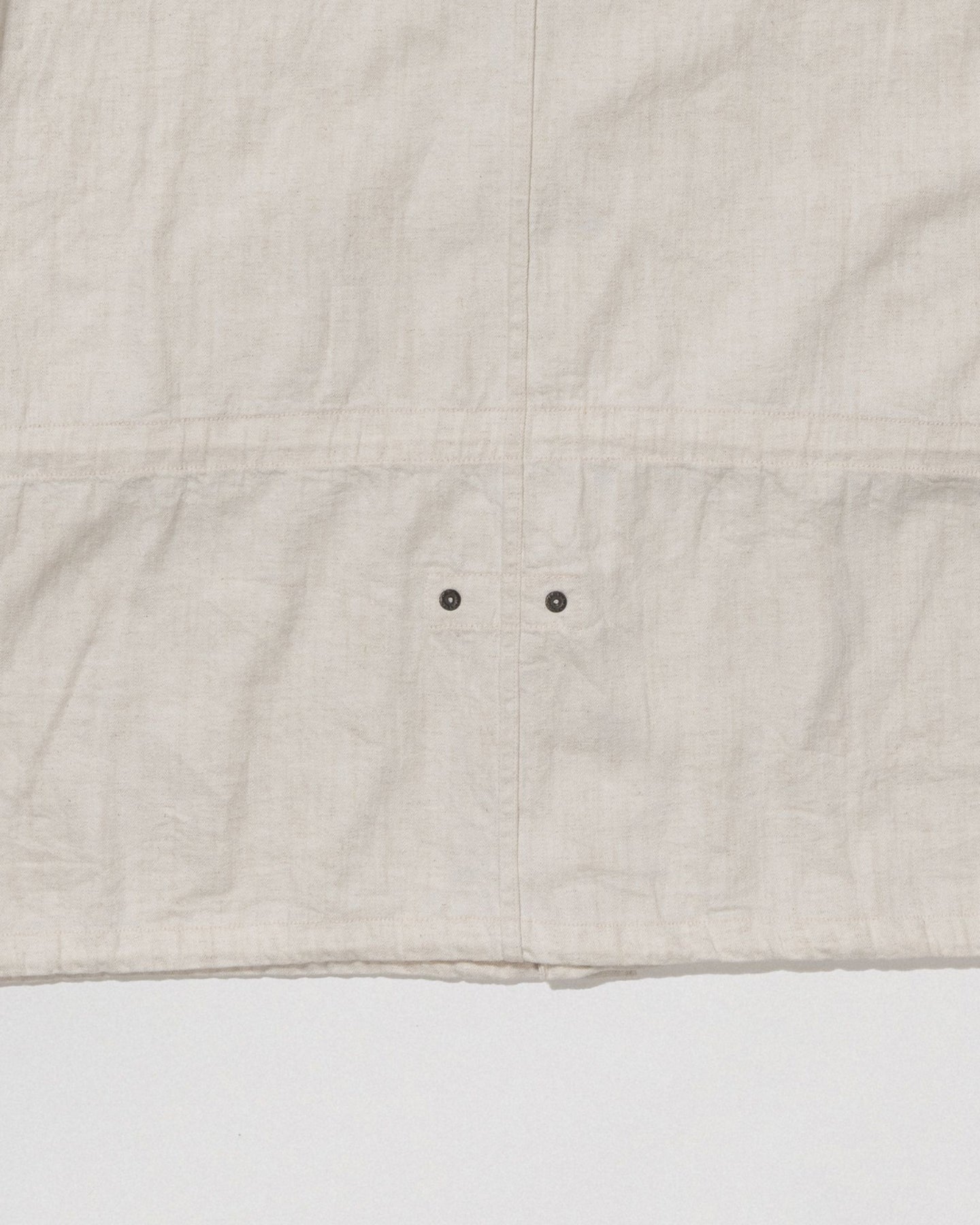 タテ糸は晒の白糸、ヨコ糸はリネンの先染めで織られたファブリックはあえてタテ糸を白にすることで、通常の白色生地より深みがある色味に。