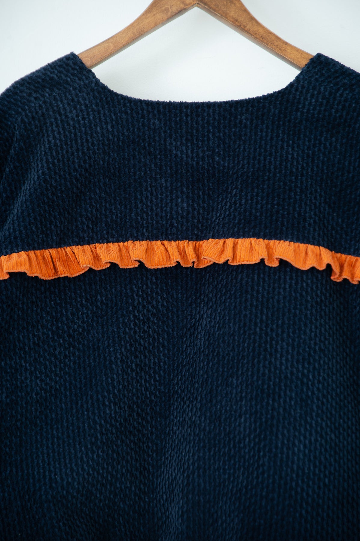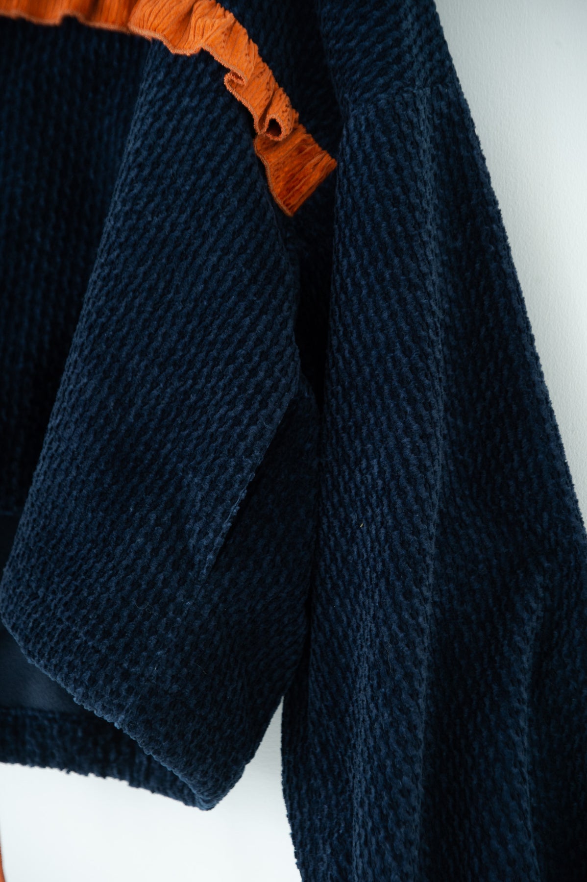 首周りをスッキリとしつつ要となるフリルと調和したショート丈のノーカラージャケットです。