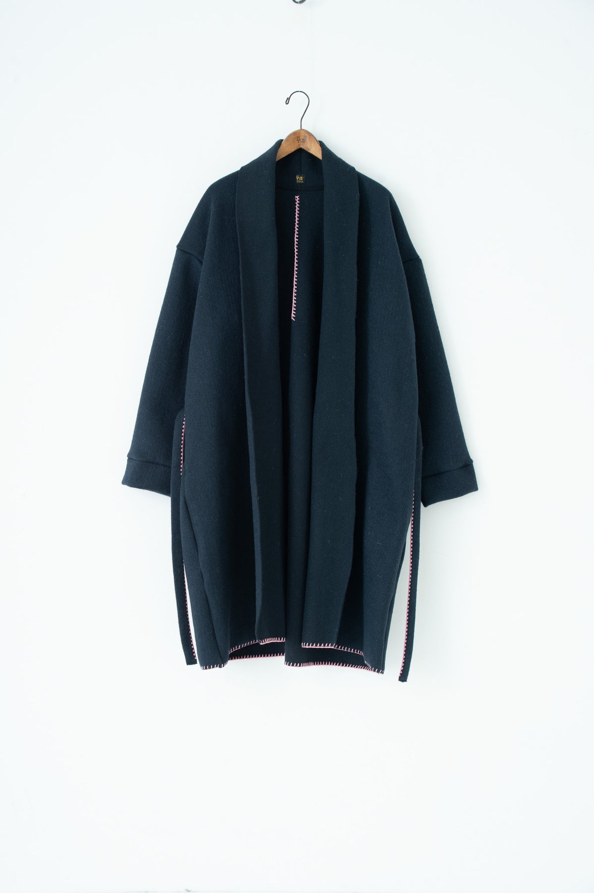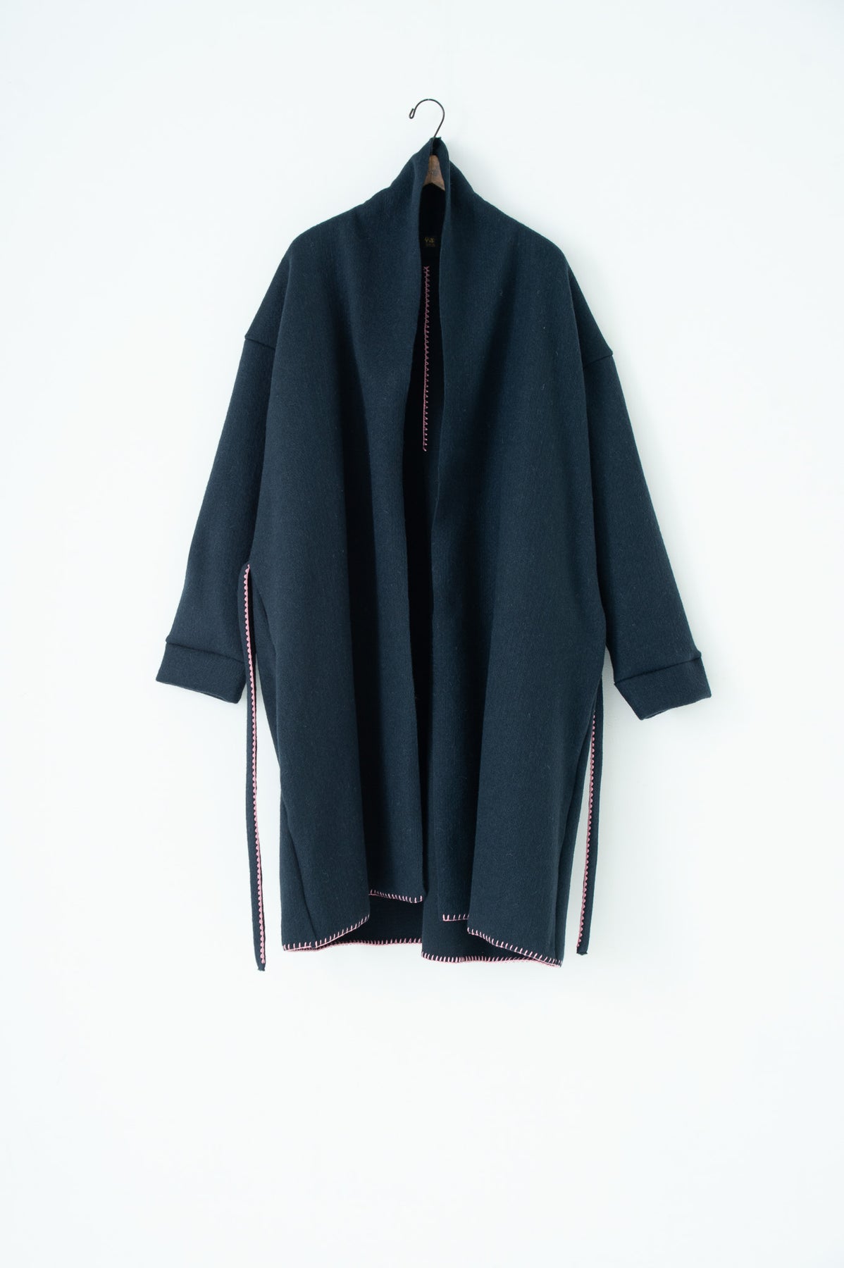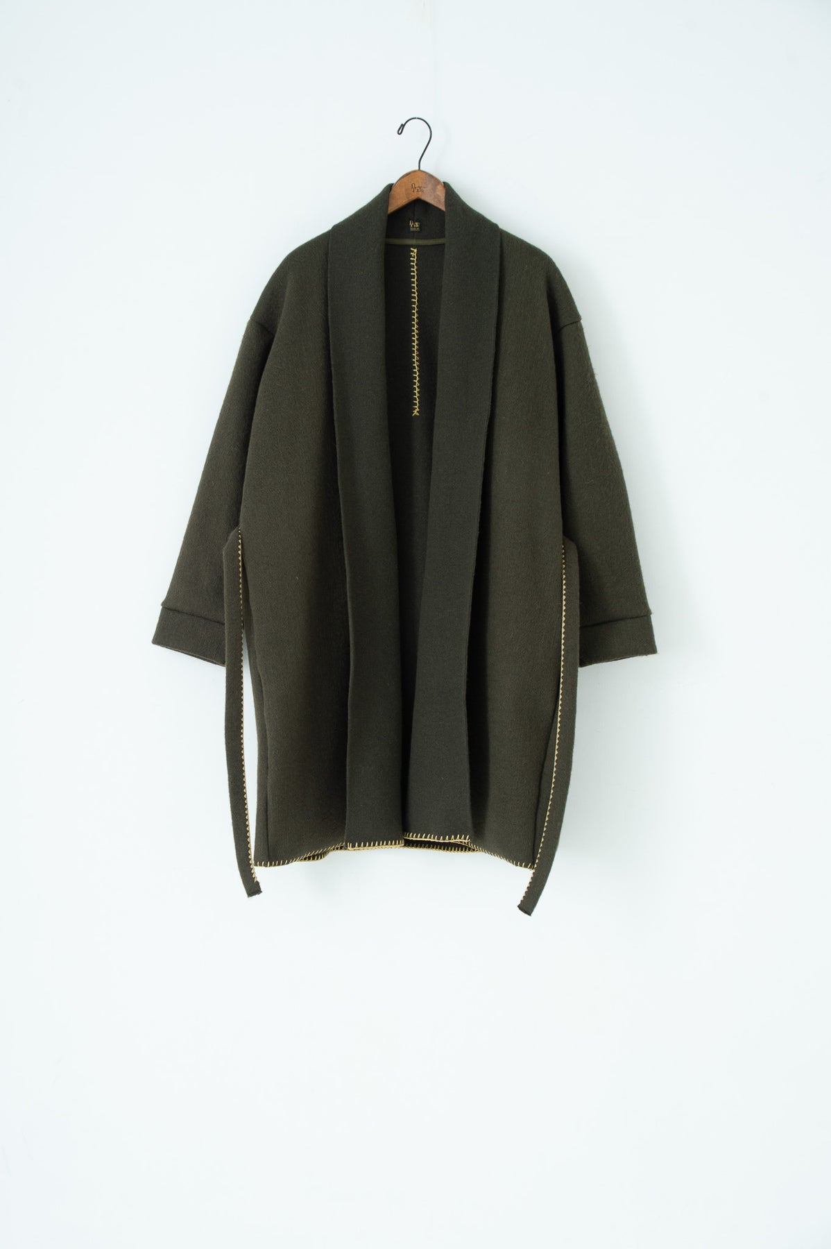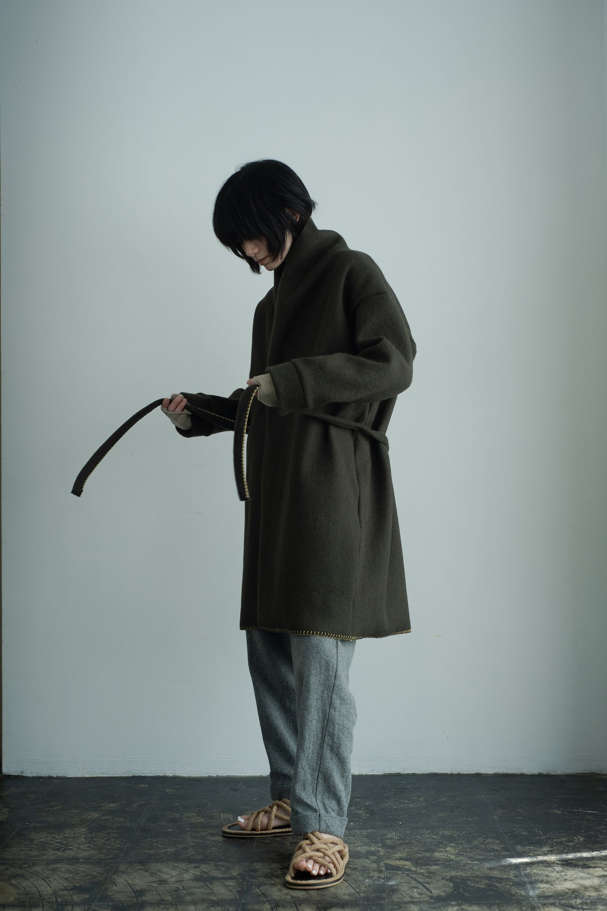 襟を折る、立てるにより全く違った装いをみせる2wayタイプのガウンコートです。