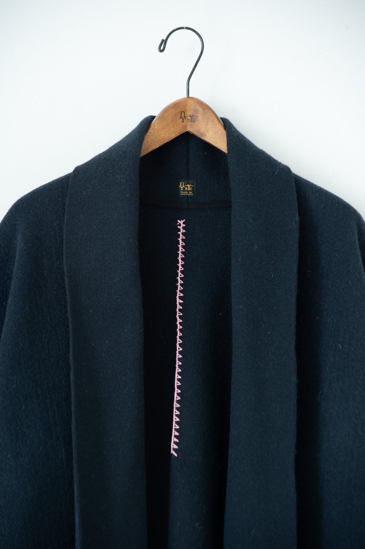 センターバック、裾、ベルトそれぞれに違う種類のニードルワークを1つ1つ施し、大地の寒い冬を乗り越える民族服に暖かみを+αしております。