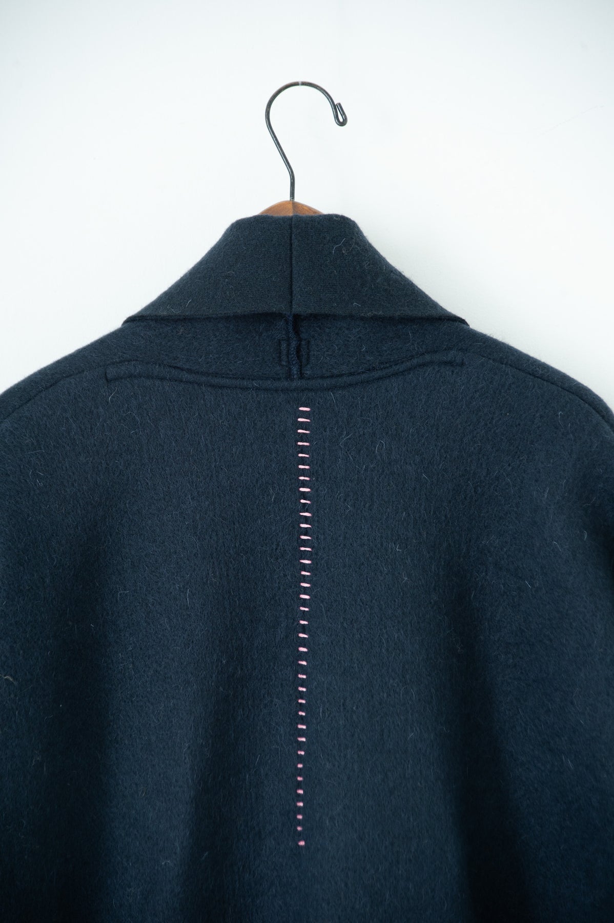 シルエットの追求に重きを置きあえてポケットや打ち合わせボタンを無くすことでより洗練された雰囲気に仕上げています。