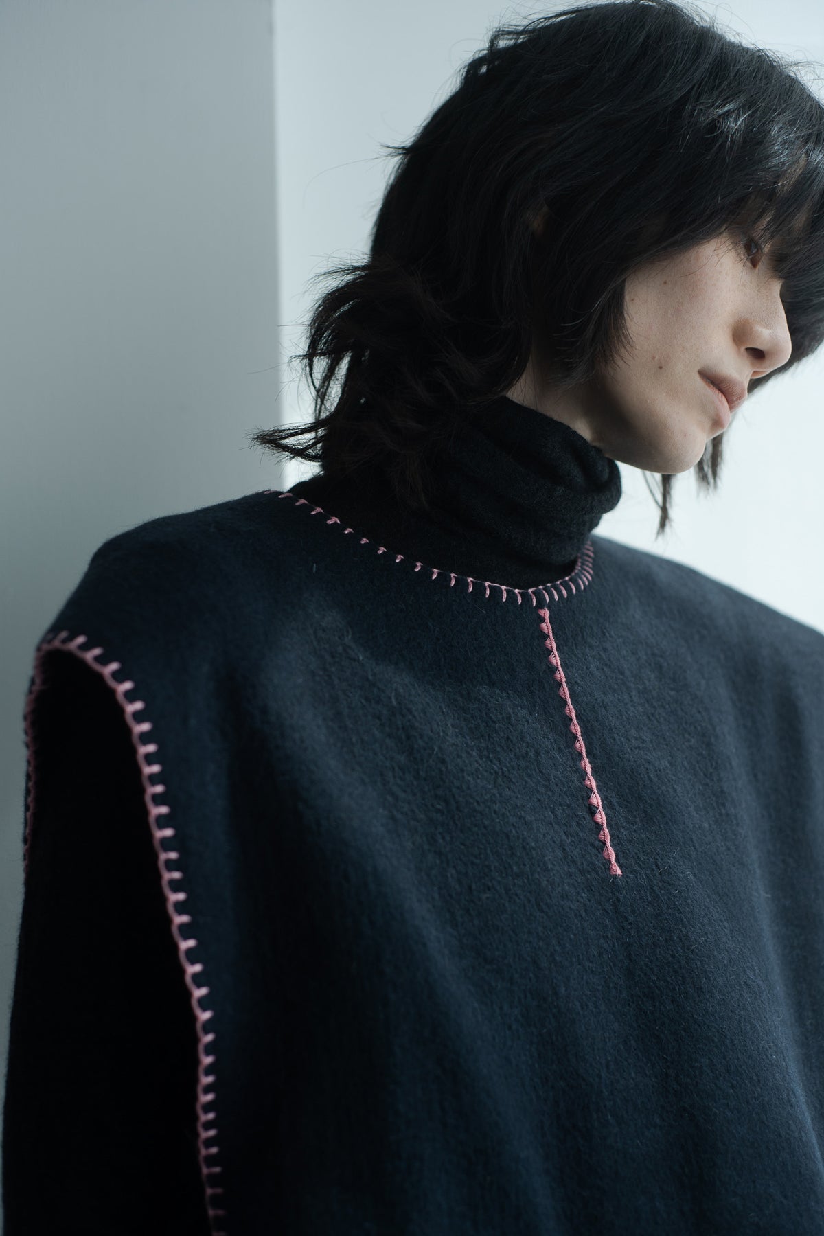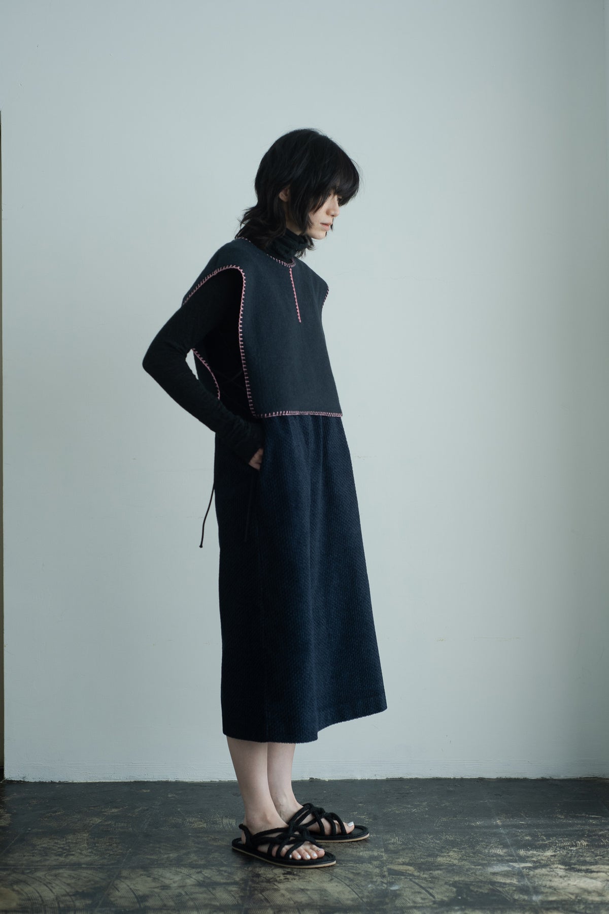 センターフロント、ネック、裾、それぞれにニードルワークを施し、大地の寒い冬を乗り越える民族服に暖かみを+αしております。