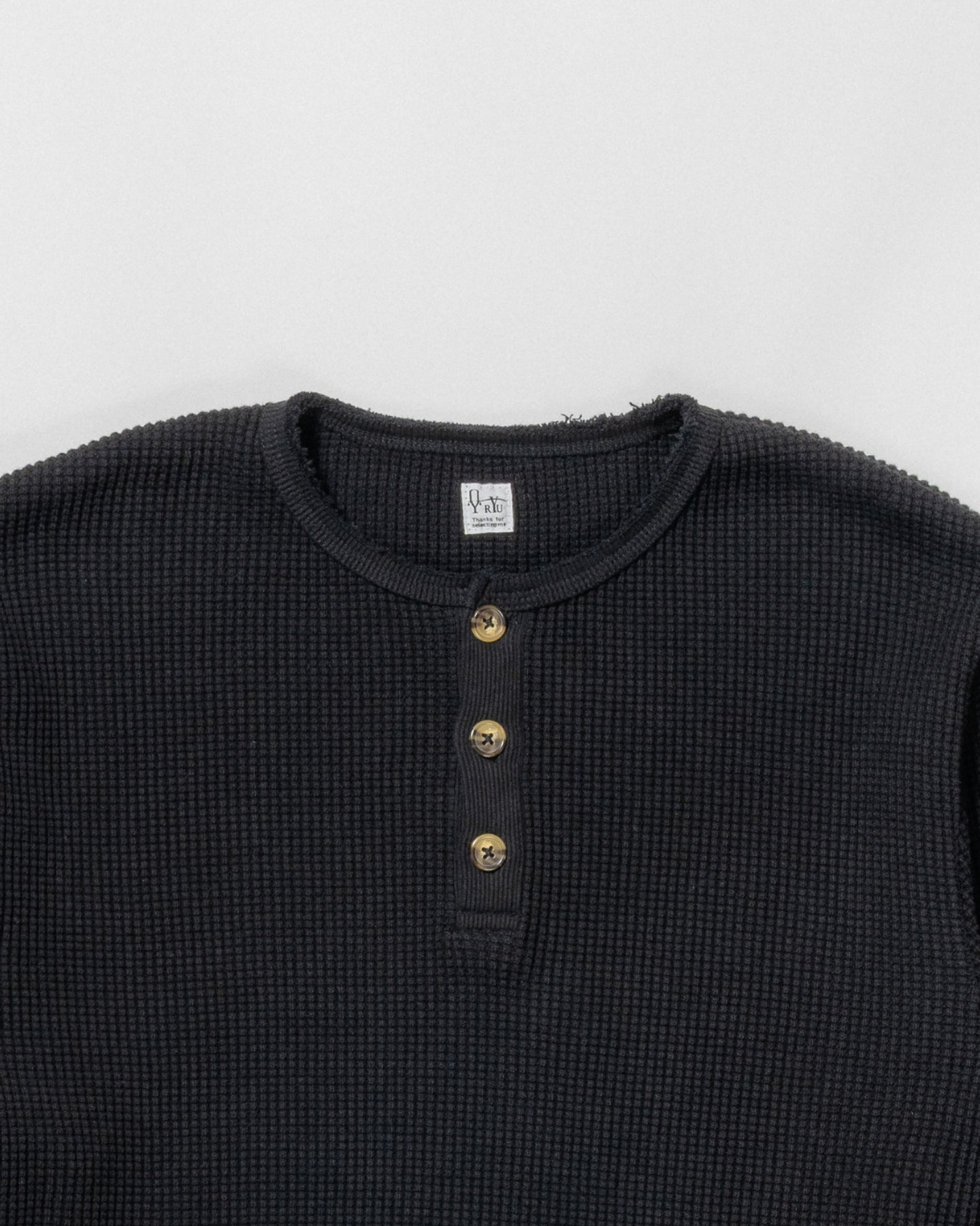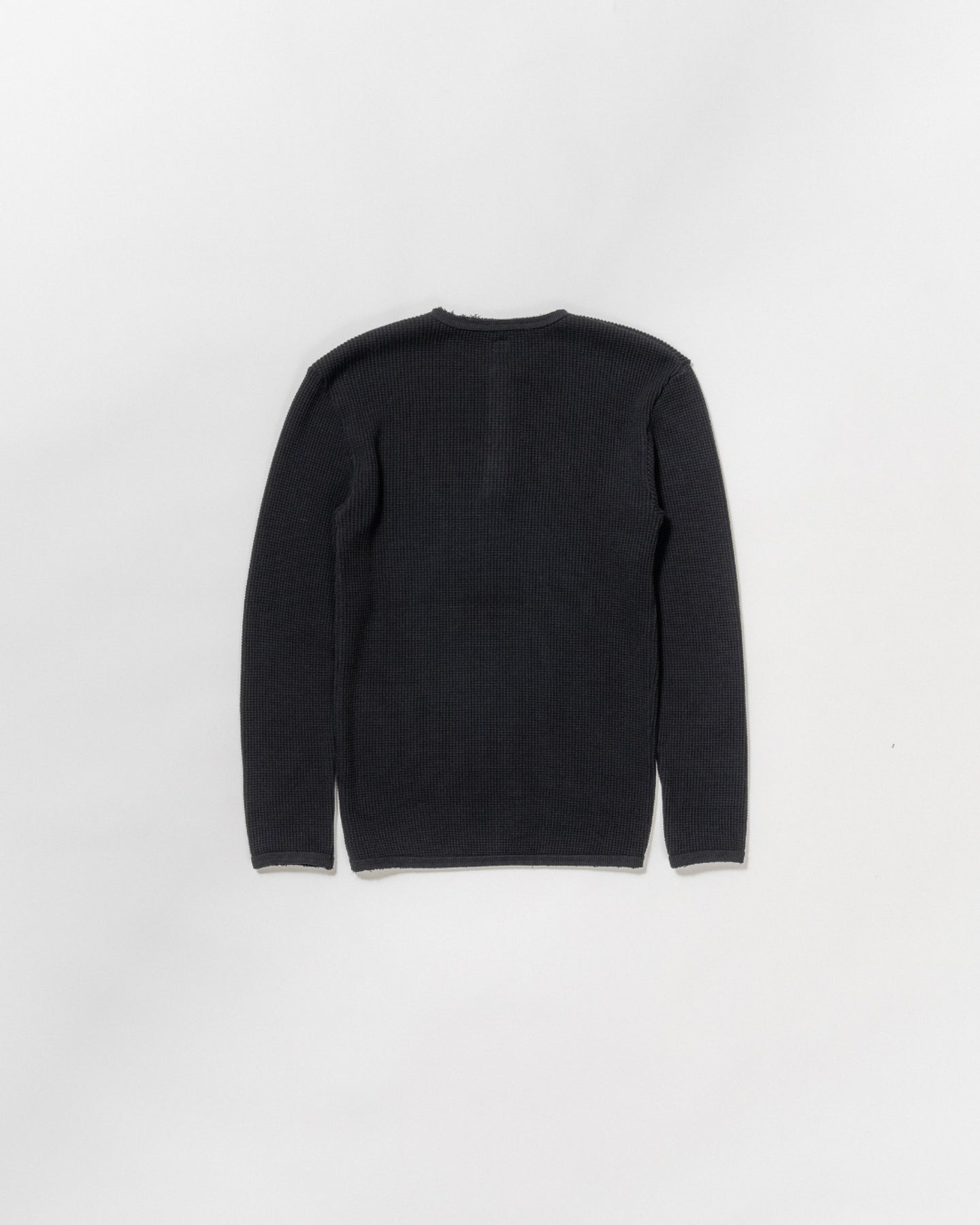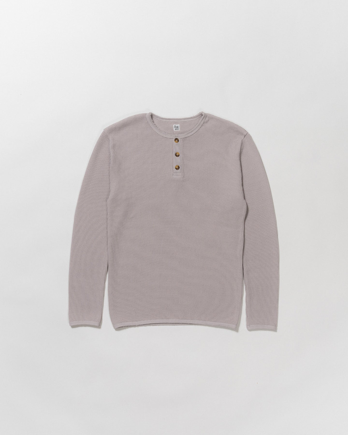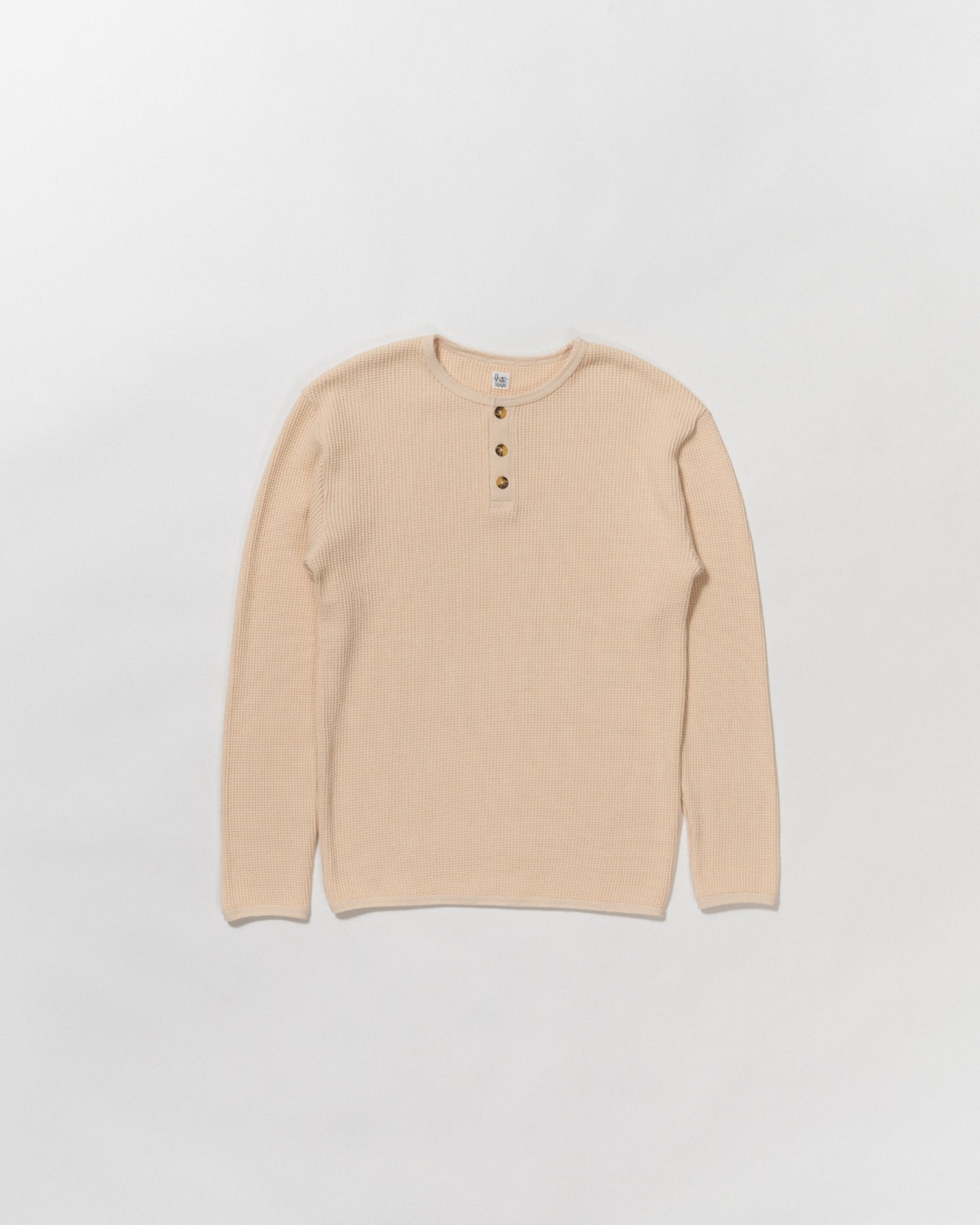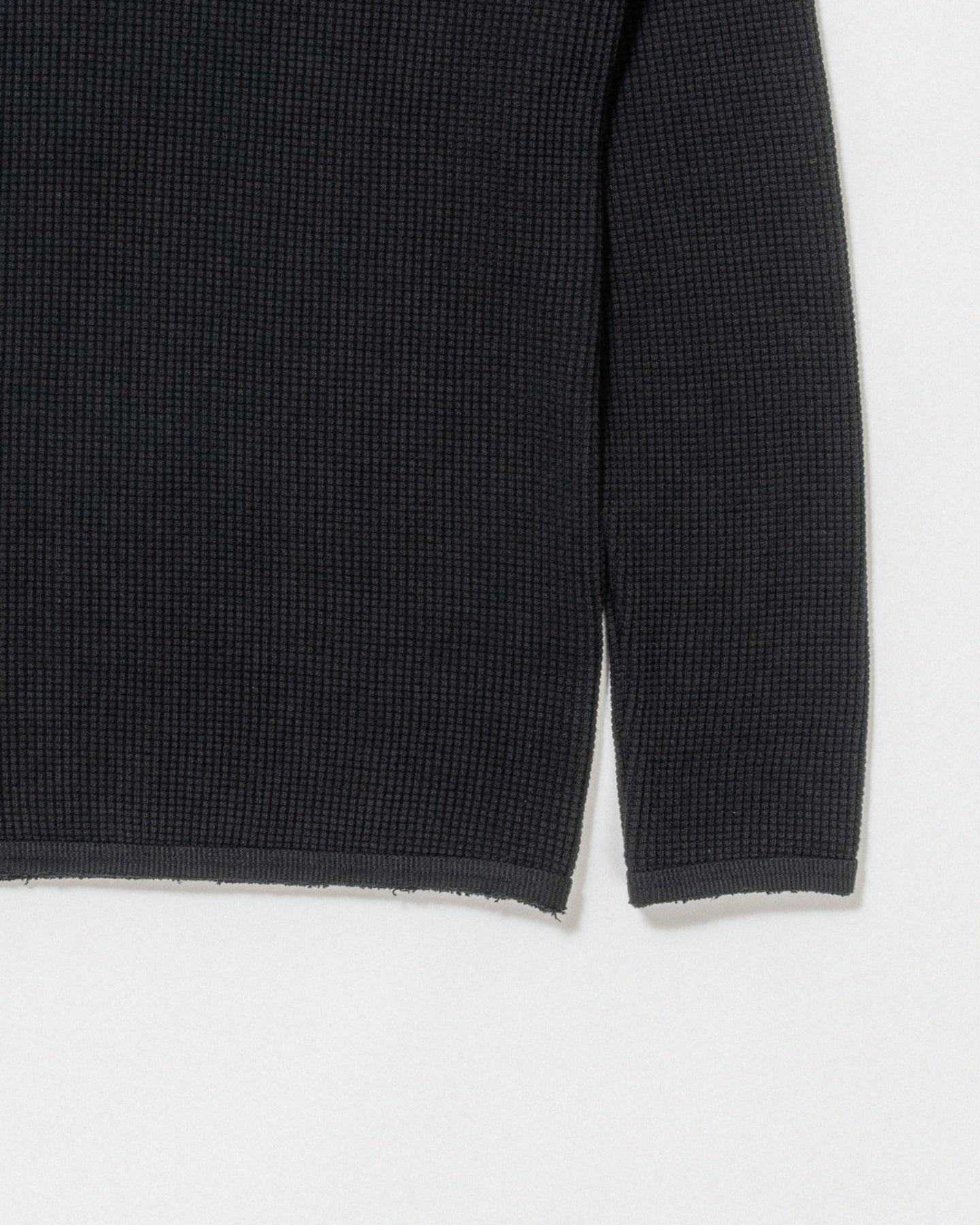 通常のワッフル素材は型崩れしやすいため、RYUの生地作りの拘りとして、できるだけ太番手の糸を使用し、編み目をしっかりと詰めて製作された、独自の素材になります。
