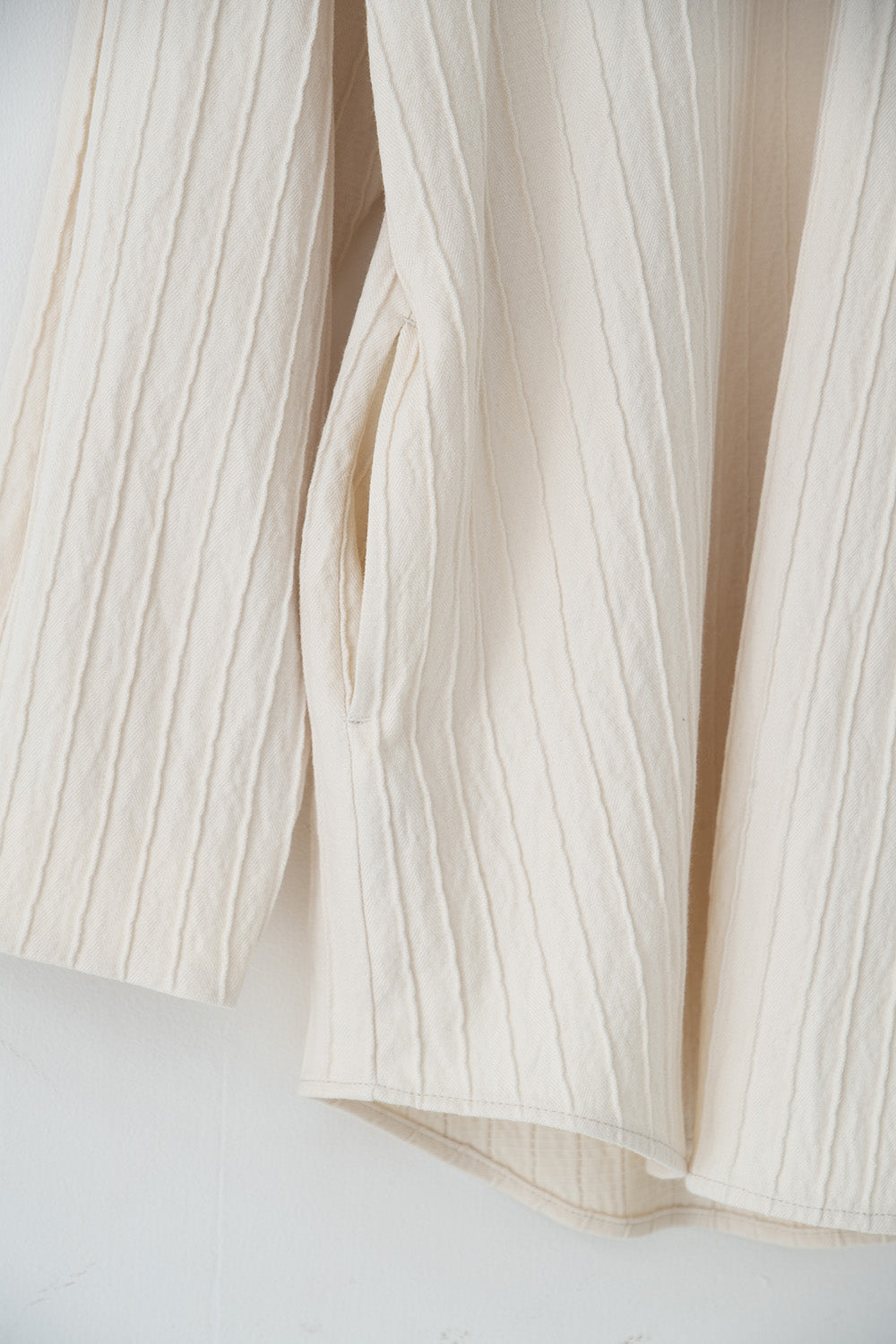又、横ストレッチの糸を部分的に飛ばすことでストライプの畝を作るテクニカルなマテリアルです。